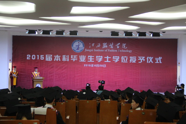 学通社讯(朱雨春/文   万强 朱雨春 左正鹏/摄影) 6月26日的江服校园,处处是成长的味道。我校首届本科毕业生带着半年的实习收获和激动的心情,今天回到母校接受学业生涯中最神圣的学士学位授予仪式,这既是一个收获和喜悦的时刻,也是一个庄严和充满希望的时刻。上午8点30分,江西服装学院院长陈万龙博士、学术委员会主任温容祯教授、党委副书记温诒忠教授、总督学杨汉东副教授,学校学位评定委员会全体委员和毕业班班主任、相关指导老师,2015届获学位毕业生齐聚思贤楼报告厅,参加江西服装学院2015届本科生学士学位授予仪式。