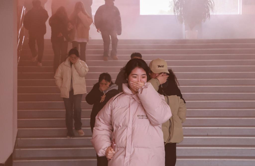 演练开始前,各学院师生已在主教学楼前集合完毕,准备就绪。保卫处处长鲍鹏向在场师生强调消防安全的重要性,梳理了校园日常生活中存在的消防隐患,并对此次消防应急疏散演练活动进行部署。随着李宝君副校长的一声令下,演练正式开始。保卫处迅速点燃烟雾并发出警报,师生们迅速反应,用手、袖子和湿毛巾捂住口鼻,弯腰有序地从指定楼梯通道撤离。各楼层的保卫人员和宿管员在现场指挥,确保疏散过程的安全和效率。