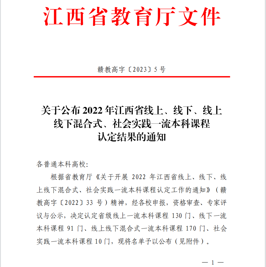 新闻中心讯(供稿:教务处)近日,江西省教育厅发布《关于公布2022年江西省线上、线下、线上线下混合式、社会实践一流本科课程认定结果的通知》(赣教高字﹝2023﹞5号),我校大数据学院徐照兴教授主持的《面向对象程序设计》、赵德福副教授主持的《电子商务》2门课程被认定为省级线上线下混合式一流本科课程。截至目前,我校共有省级一流本科课程18门。