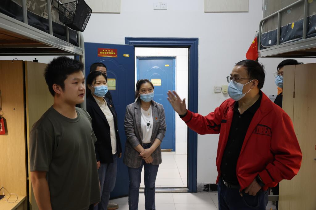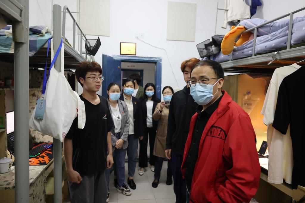 为深入了解同学们的日常生活、学习、工作情况及疫情防控期间同学们的思想状况,傍晚时分,陈付龙书记走访学生宿舍,深入学生,交心交友,畅谈人生。他关切地了解了同学们对学校线上教学、宿舍管理、服务保障等方面的意见和建议,耐心解答同学们提出的问题;随后,陈付龙书记来到党员活动中心,他指出要充分利用好,积极开展学习与交流活动,充分发挥学生宿舍育人阵地作用。陈书记鼓励同学们要努力学习、脚踏实地、练就过硬本领,争做一名有理想、有本领、有担当、有作为的新时代大学生,让青春在奉献中焕发绚丽光彩。