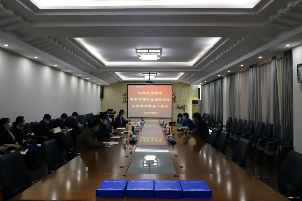 服装报讯:4月27日上午,省教育厅复学督查组一行三人来我校进行2020年春季学期学生返校学习工作专项督查。我校理事长涂顺强,校长陈万龙,常务副校长徐炜,副校长陈东生、杨涛,党委副书记高建国和相关职能部门负责人参加了专项督查汇报会。