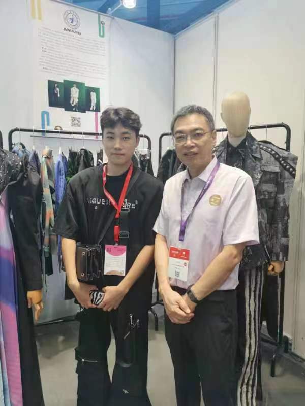 我校创新创业学院院长段婷介绍,江西服装学院实行五育并举、方向分流、应用为要“三位一体”的人才培养方案,构建了专业学院、产业学院、双创学院“三院联动”的人才培养模式,建立了高校、政府、企业“三方协同”的合作育人生态体系。她表示,此次能来参展,机会难得,因为展会是和市场、企业直接对接。江西服装学院创新创业学院通过这次展会,将学校的一些作品推向市场,把作品变成商品,真正融入市场。这次展会带来的是两位老师成立的一个品牌——Chen.1988,他们都是全国十佳设计师。段婷最后表示,非常感谢“纺织之光”给予这样的机会,希望今后能有更多的机会,能到市场中去竞争,与市场进行沟通和交流。