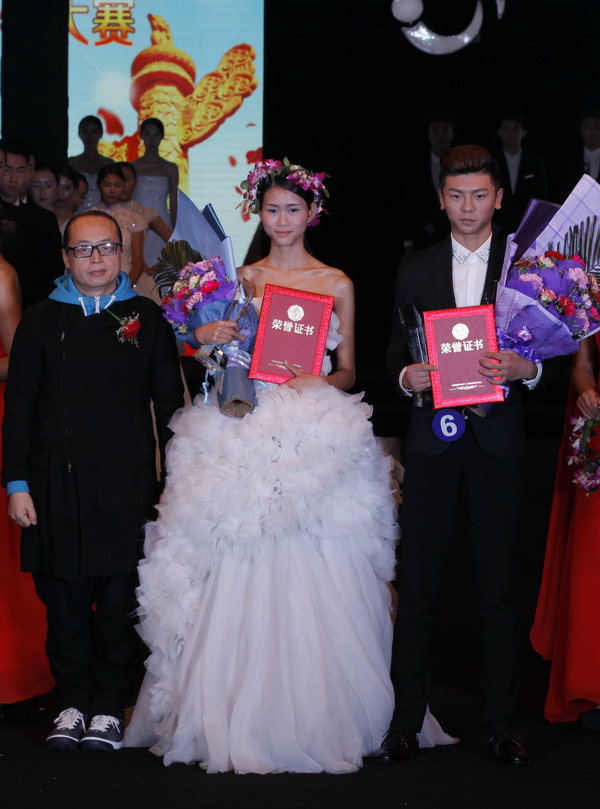 武汉纺织大学服装学院副院长袁大鹏为服装设计大赛冠军颁奖合影