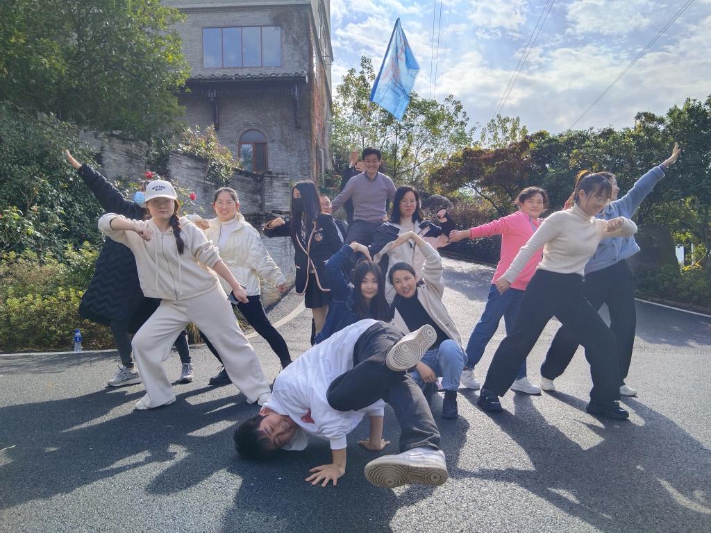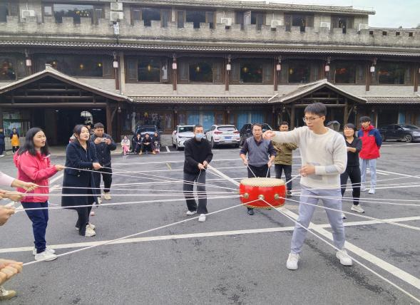 户外素质拓展以激发个人潜能、促进团队合作为活动核心。全体辅导员默契配合,在热身运动“桃花开”“水果蹲”等活动过程中的合作为下一步提升了团队协作默契。热身运动后,全体参训者以报数分组的方式组建团队,开始了充满竞争与合作的体验式拓展训练。每个队伍选出队长、副队长以及旗手,确定队名、队歌、口号以及“海陆空”的造型。随后进行了“击鼓颠球”和“大河之舞”的比拼,全体参训者信心满满、奋勇争先,激情无限。活动现场热烈非凡,全体人员情绪高涨昂扬。