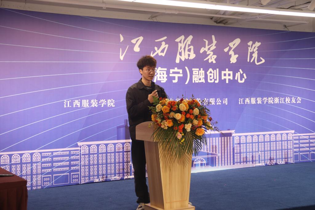 江西服装学院海宁校友郭松代表校友发言,感谢了母校的培养,表示在校期间收获了丰富的专业课程知识和创新创业教育,为其进入社会后的成长和发展奠定了坚实的基础。他也感谢了海宁中国皮革城股份有限公司的一系列创新创业帮扶政策为其在创业路上保驾护航。他表示,会为(海宁)融创中心贡献自己的一份力量,积极搭建学校与企业的桥梁,促进学校人才培养与社会服务能力不断提高。