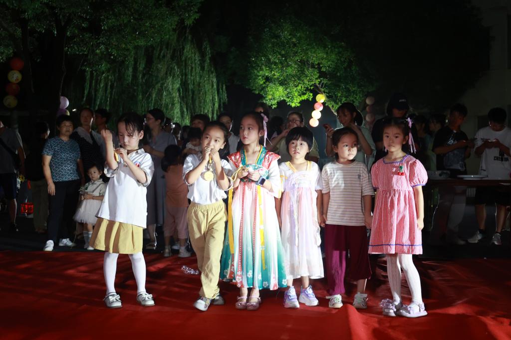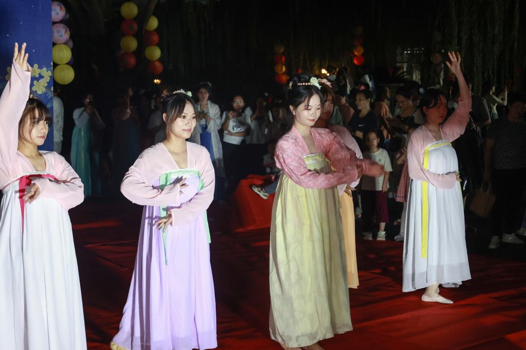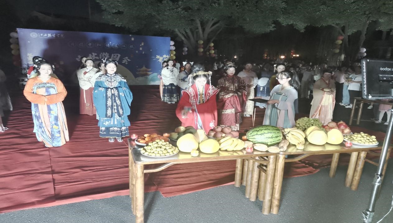 活动现场灯光璀璨,柳树上悬挂着五颜六色的灯笼,现场一片欢声笑语,热闹非凡。现场设大香案,香案上摆上了月饼、西瓜、苹果、红枣、葡萄、莲藕等祭品。身穿汉服的师生将“月神”牌位放在月亮方向,红烛高燃,列着整齐的队列依次拜祭月亮,祈求福佑。祭月赏月,托月追思,同时也表达了师生的美好祝愿。