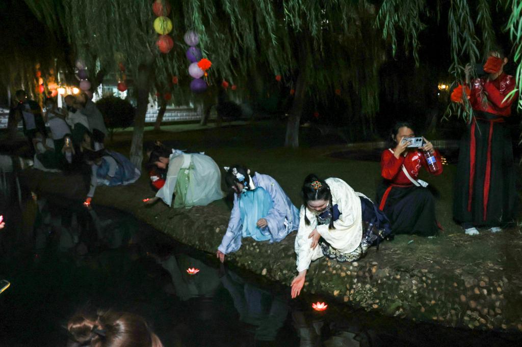其二,放花灯祈福。身穿汉服的师生分成二队,手提中秋兔子灯分别把河灯放入池水中,为家人的幸福安康祈福。