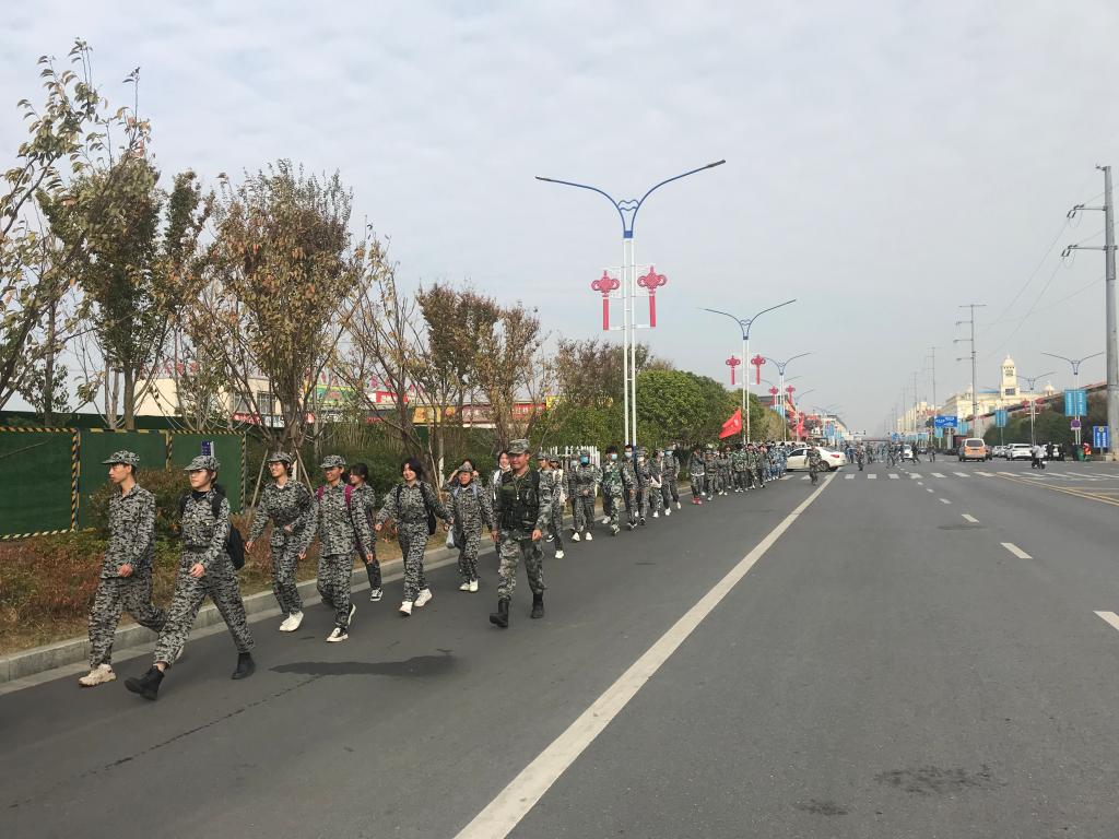 虽然天气闷热,路途遥远,但同学们的斗志依然昂扬,唱着军歌、喊着口号,互相加油打气,坚持完成了14多公里路的行军拉练。