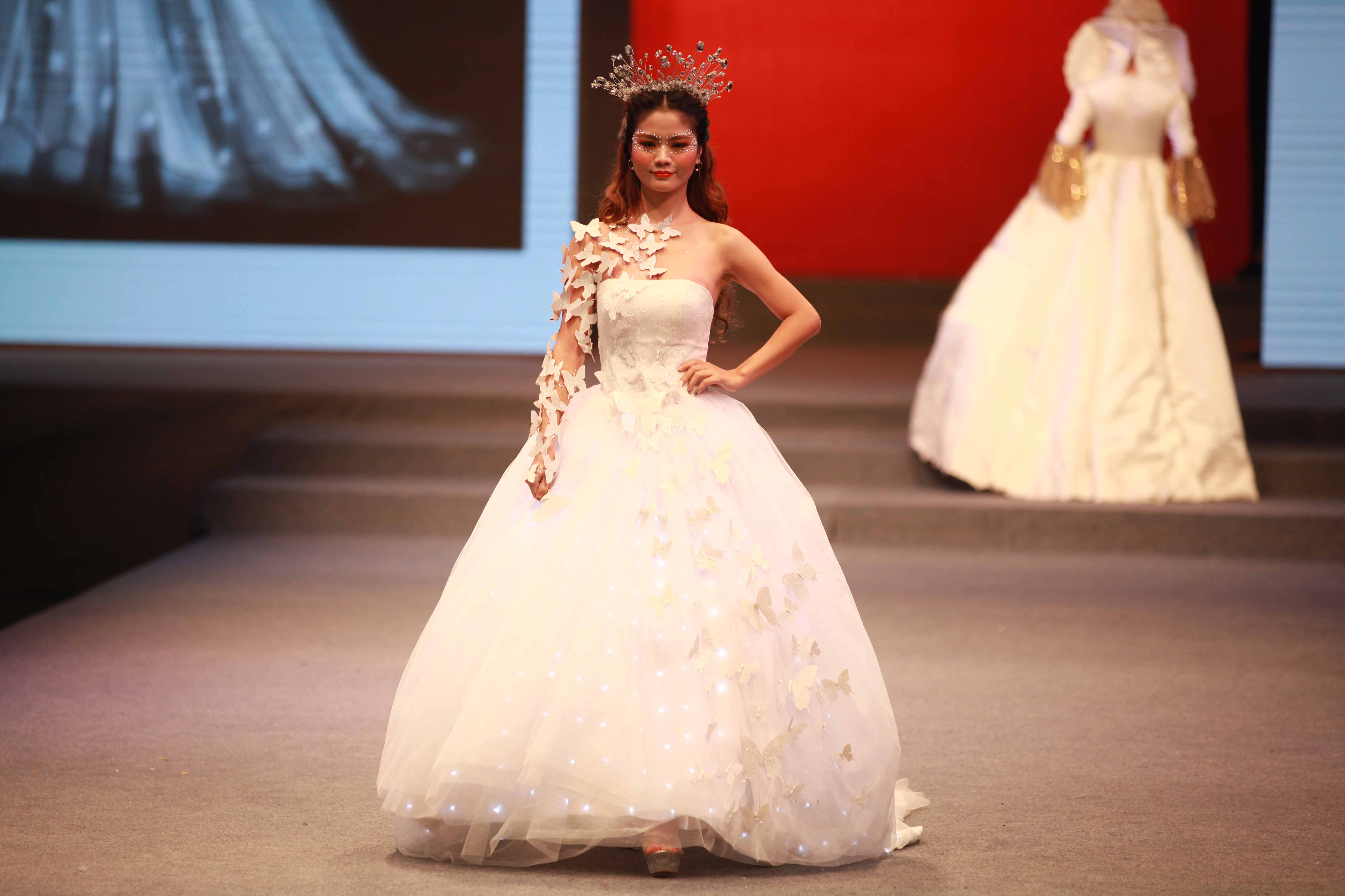 本次大赛主题为“浪漫•狂想•剧”, 大赛共分为三幕:“童话造型”、“盛装晚宴”和“复古造型”。共筛选出三十套服装参赛,作品风格多样,设计新颖,为大家呈现出了一场华丽缤纷的视觉盛宴。随着舞台上伴奏音乐的悠扬声响起,比赛正式开始。最先出场的是“童话造型”系列,以电影《灰姑娘》为创作原型,如3号设计师俞圆圆的作品以黑红为主色调设计的造型体现了继母特曼妮的冷酷。紧接着是以《公爵夫人》为题的“盛装晚宴”,简单直接的开场,仿佛带领大家走进了中世纪的欧洲,尤其是10号设计师李荣的红色礼服高贵优雅,再加上用心准备的配饰装扮,其造型上的各种细节都不由得让人为之赞叹。在充满民族风情的音乐声中,来自时尚传媒分院的何思敏老师身着民族风服装快步上台,为大家带来了一段精彩的民族舞蹈,婀娜多姿的舞姿赢得了现场观众的阵阵掌声。