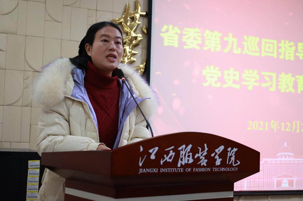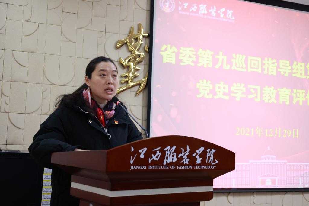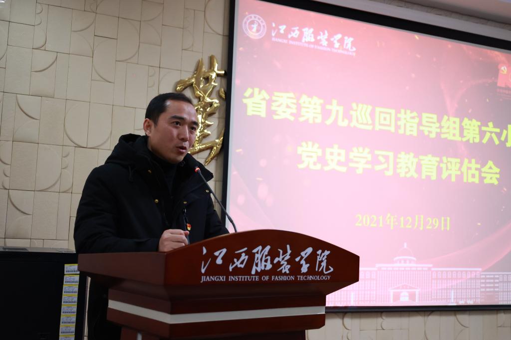 汇报会上,党委书记陈付龙以《久久为功 将党史学习教育贯穿人才培养与立德树人全过程》为题,从“我校党史学习教育开展的总体情况”、“党史学习教育推进我校教育事业发展的成效”、“我校开展党史学习教育的主要措施”、“我校党史学习教育的特色和亮点”、“存在的主要问题与整改措施”等5个方面,详细汇报了我校开展党史学习教育总结情况和测评工作情况。自党史学习教育启动以来,江西服装学院党委严格按照中央和省委、省委教育工委党史学习教育领导小组的统一部署和要求,以“高起点开局,高标准推进,创新方式方法,转化教育成果”这一总体目标全面推进党史学习教育工作,将党史学习教育科学融进学生思想政治教育、融入专题学习培训、贯穿学校人才培养和立德树人全过程,教育引导全校党员师生学党史、悟思想、办实事、开新局,广大党员在党史学习教育中久久为功赓续红色基因,立德树人坚守教育初心,将学习成果转化为继续前进的勇气和力量,以昂扬姿态奋力推动学校高质量发展,推进学校建设特色鲜明高水平应用型大学的目标早日实现,以优异成绩迎接党的二十大的胜利召开。