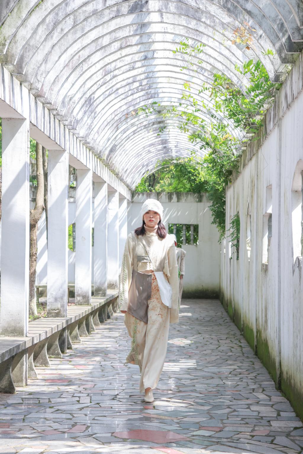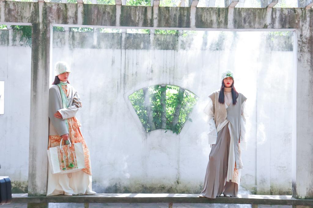 第一个展示作品的场景是曲径通幽的中式走廊。在烟雨江西的氤氲氛围下,融于情景之中的设计作品一镜到底。设计师们钟情于传统手工艺,一套精细拼布作品率先出场。面料轻薄如雾如烟,跟随身体的摆动产生如诗如画的唯美意境。解构依然是他们创新的突破口,在有限的服装载体上大胆进行创意实验,一套焰火般色彩的女装闯入视线,这是设计师不灭的创作火焰。