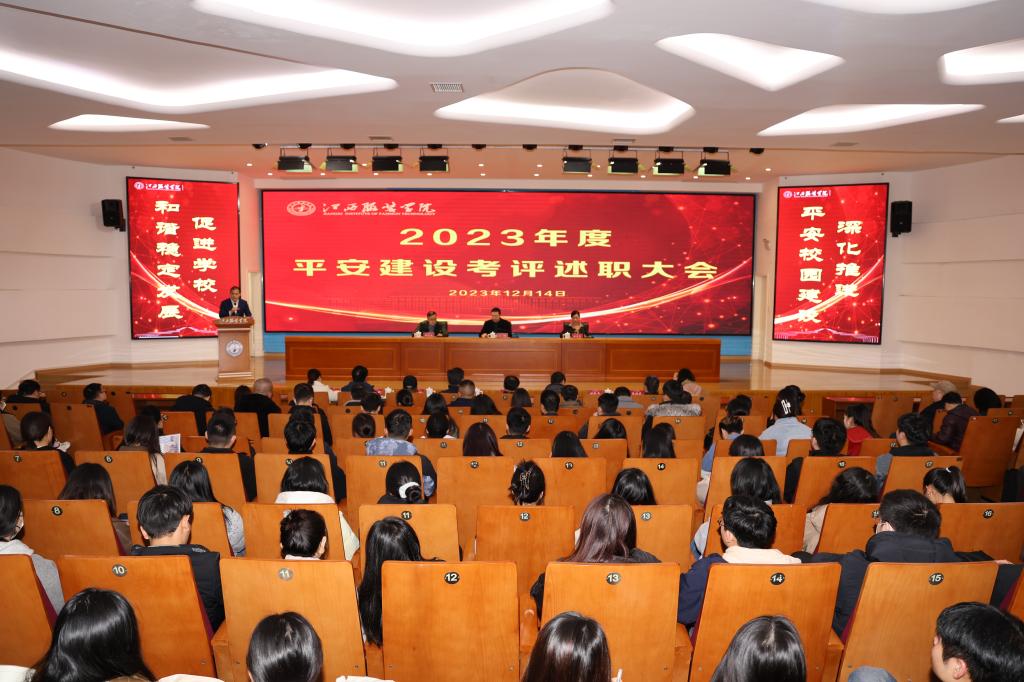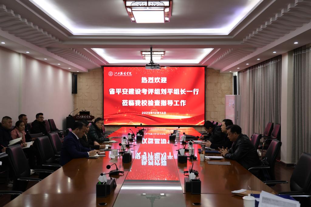 新闻中心讯(文/万强 图/万强 樊翔)12月14日上午,以省司法行政机关二级警务专员刘平为组长、省司法厅一级调研员陈国盛、中国铁路南昌局集团有限公司保卫部干部常勇为成员的省平安建设考评专家组莅临我校开展2023年度考评工作。学校在思贤楼三楼报告厅举行平安建设述职大会并现场开展满意度测评。江西服装学院理事长涂燕萍、党委书记陈付龙出席会议,全体在家校领导,各部门、二级学院主要负责人及师生代表150余人参加考评会议,大会由校党委副书记唐新强主持。