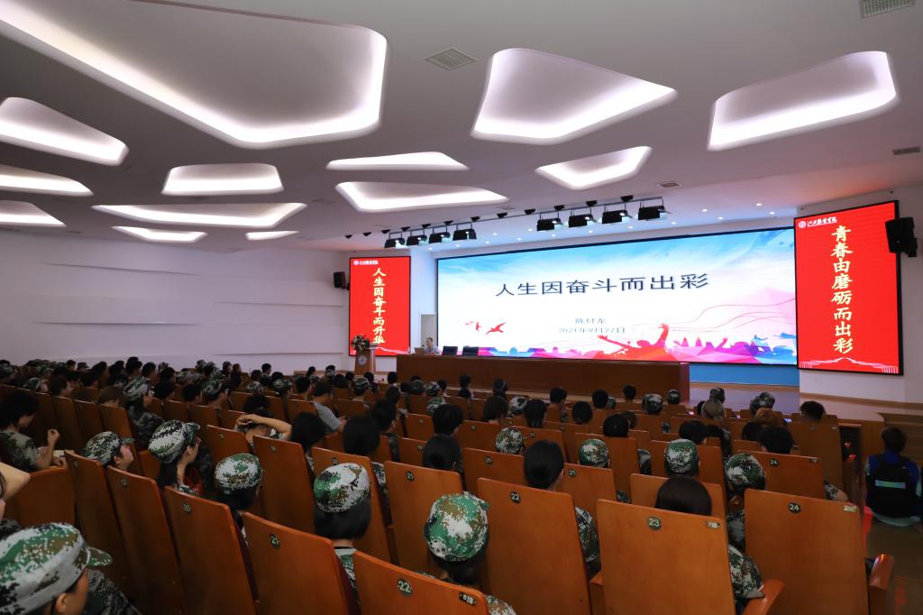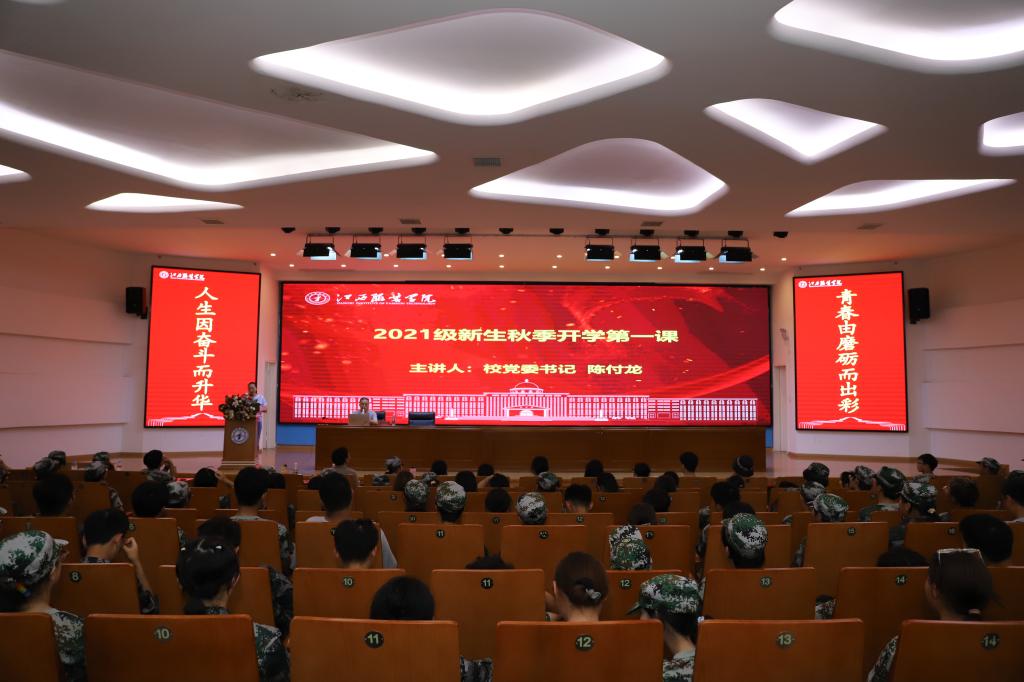 (新闻中心讯) 为进一步强化思想理论教育和价值引领,引导广大青年大学生扣好人生第一粒扣子,9月27日,江西服装学院党委书记陈付龙以《人生因奋斗而出彩》为题,为2021级新生讲授开学第一课。今年的开学第一课,别开生面,干货满满。