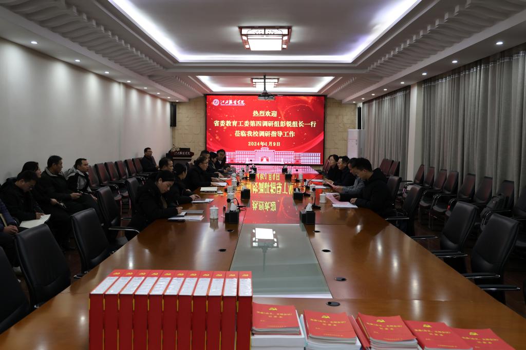 新闻中心讯(党委组织部供稿 摄影/万强)为深入贯彻落实党的二十大精神,进一步巩固扩展学习贯彻习近平新时代中国特色社会主义思想主题教育成果,认真学习贯彻习近平总书记关于党的建设的重要思想,深入贯彻落实习近平总书记考察江西重要讲话精神,全面提升基层党建工作质量。1月9日下午,省委教育工委第四调研组一行在组长彭锐的带领下莅临我校开展党委书记抓党建工作调研。校党委书记、督导专员陈付龙,党委副书记、副校长李宝君,党委副书记唐新强,校长助理闵悦等校领导,校党委委员和二级学院党组织书记参加调研汇报会和反馈会。