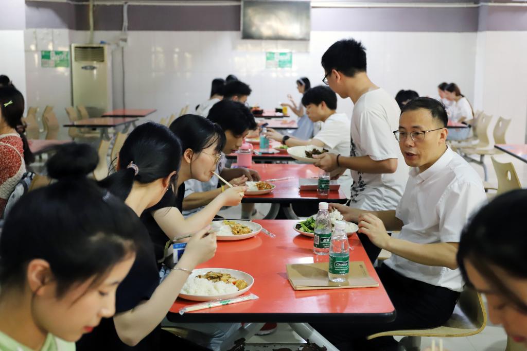 在第三食堂,陈付龙和同学们一起吃午餐,他们边吃边聊,“学习之余有无兼职?”、“一个月大概多少生活费?饭菜价格是否适宜、口味是否习惯?……”他细心地关注身边围坐的每一位同学,了解学生学习情况、生活情况、家庭情况,细致入微的询问,让在座的每一位学生都倍感温暖。