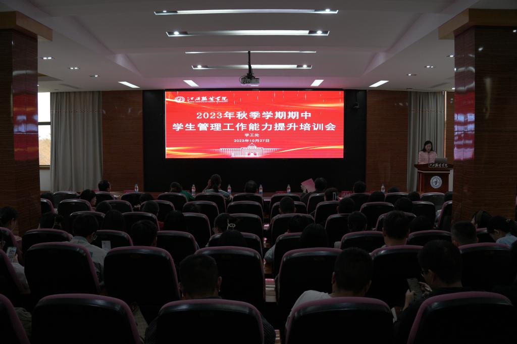 新闻中心讯(文/学工处 刘检莲 图/万强) 为深入学习宣传贯彻习近平新时代中国特色社会主义思想和党的二十大精神,进一步聚焦辅导员主责主业,深耕专业成长,充分发挥辅导员在学校建设发展中的重要作用,切实推动我校学生工作提质增效。10月27日下午,我校举办了2023-2024学年第一学期期中辅导员工作能力提升培训会。