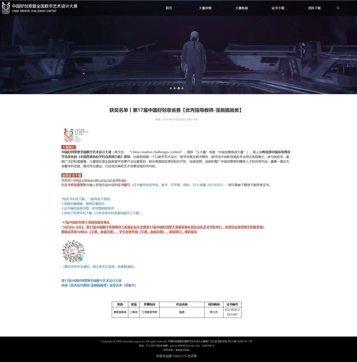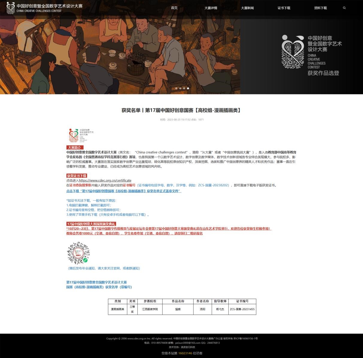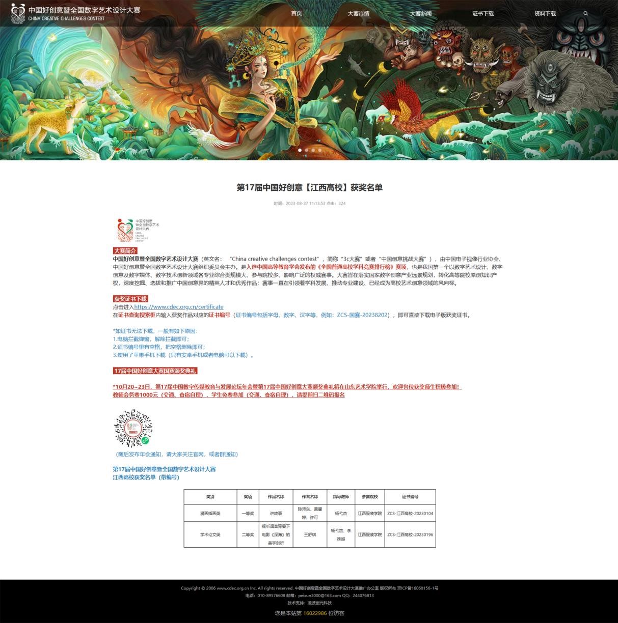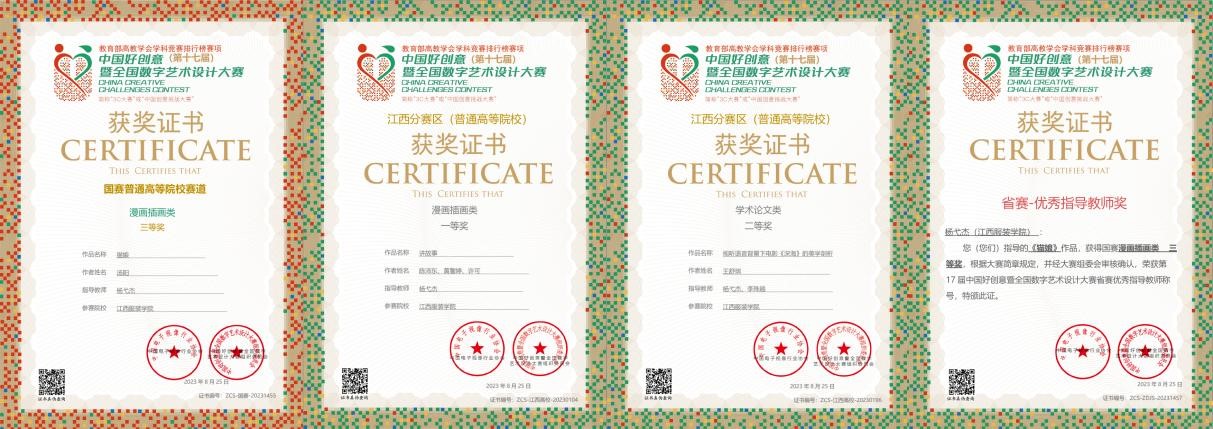 新闻中心讯(时尚传媒学院供稿)近日,由中国电子视像行业协会主办的第17届中国好创意暨全国数字艺术设计大赛(简称3C大赛或“中国创意挑战大赛”)圆满落幕。我校时尚传媒学院学生在大赛中获得全国赛三等奖1项,江西省赛一等奖1项、二等奖1项;国赛的获奖实现了我校时尚传媒学院学子在“中国好创意暨全国数字艺术设计大赛”中的零的突破。同时,动画专业教师杨弋杰老师荣获优秀指导教师奖。