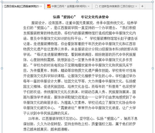 江西日报头版刊发稿件,介绍我校发挥服装教育的特色优势,将民族服饰博物馆打造成挖掘中华服饰文化内涵、促进民族团结进步的社科普及平台,将青少年的爱国心和民族情植根于学生的心中。