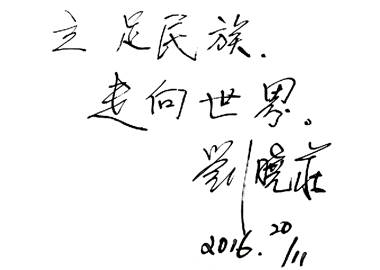 省政协副主席刘晓庄为服装博物馆题词:“立足民族,走向世界”