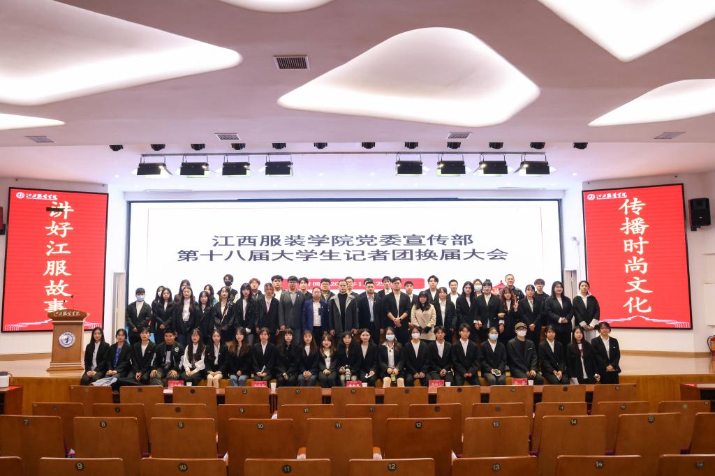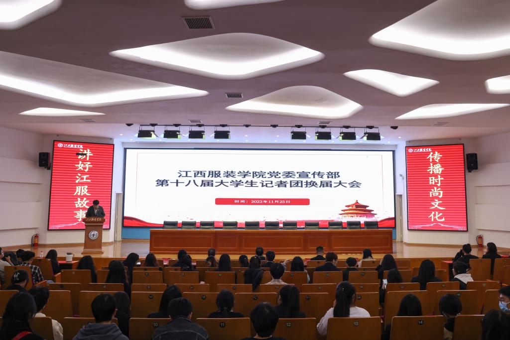 新闻中心讯(实习记者 张思珍 谭婧炜 钟丽霞 摄影/杜金晔 黄珊 黄保植 王诗)为深入学习宣传贯彻党的二十大精神,促进校园文化建设,发扬江西服装学院大学生记者团风采,11月25号下午,我校党委宣传部学生宣传队伍换届大会在思贤楼三楼报告厅召开,校党委副书记唐新强、党委宣传部副部长朱雨春出席会议,宣传部指导老师、服装报社、江服广播电视台、江服新媒体联盟、融媒体中心的学生干部参加了大会。会议由宣传教育科科长万强主持。