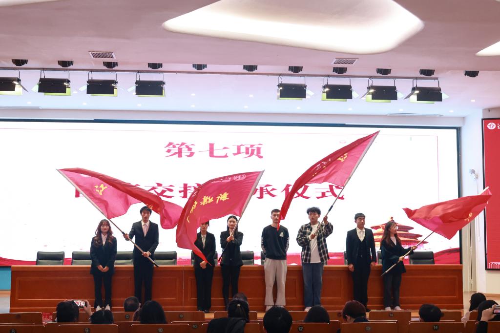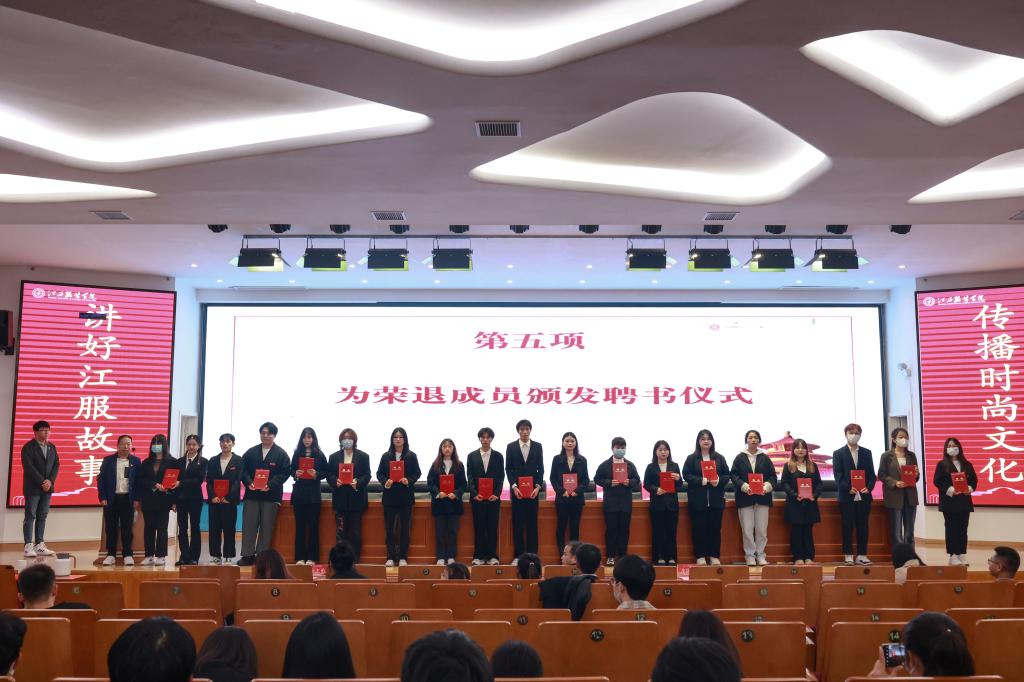 随后,大会进行了传承仪式,由服装报社学生社长、江服广播电视台学生台长、新媒体中心学生主任、新媒体联盟学生主任与新任职各团队学生负责人交接团旗。