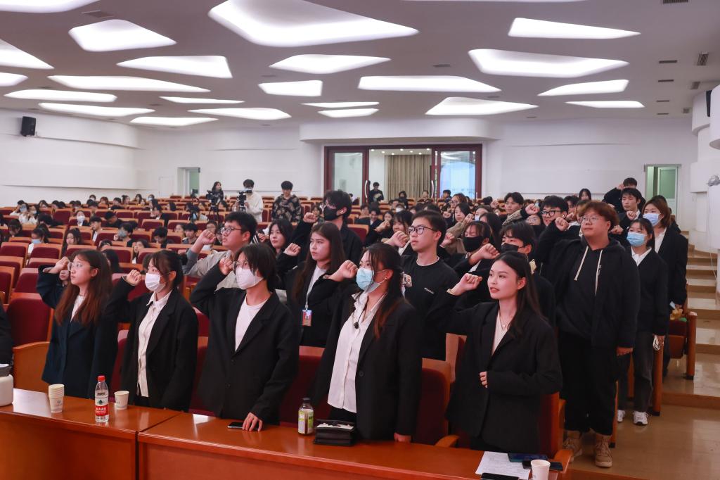 新任大学生记者团秘书长董恩禹带领新一届大学生记者团组成人员面对团旗宣誓,声音铿锵有力,眼里充满着对记者团的责任与热爱。