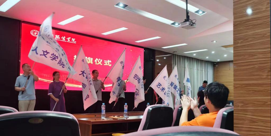 启动仪式上,党委副书记、副校长李宝君为回访母校团队授予了象征团结与合作的旗帜,二级学院党委(总支)书记依次上台接受授旗,并表示一定尽力发扬江服特色,把江服好声音传播得更远。