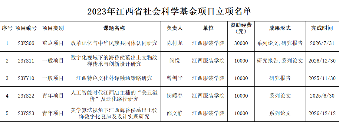 陈付龙申报的“改革记忆与中华民族共同体认同研究”为重点项目,获资助研究经费3万元;闵悦申报的“数字化视域下的海昏侯墓出土文物纹样传承与创新设计研究”、曾剑平申报的“江西特色文化外译融通策略研究”为一般项目,闵媛春申报的“人工智能时代江西AI主播的‘美丑溢价’及泛化路径研究”、邵文静申报的“美学算法视角下江西海昏侯墓出土纹饰数字化复原及设计实践研究”为青年项目,各资助研究经费1万元。