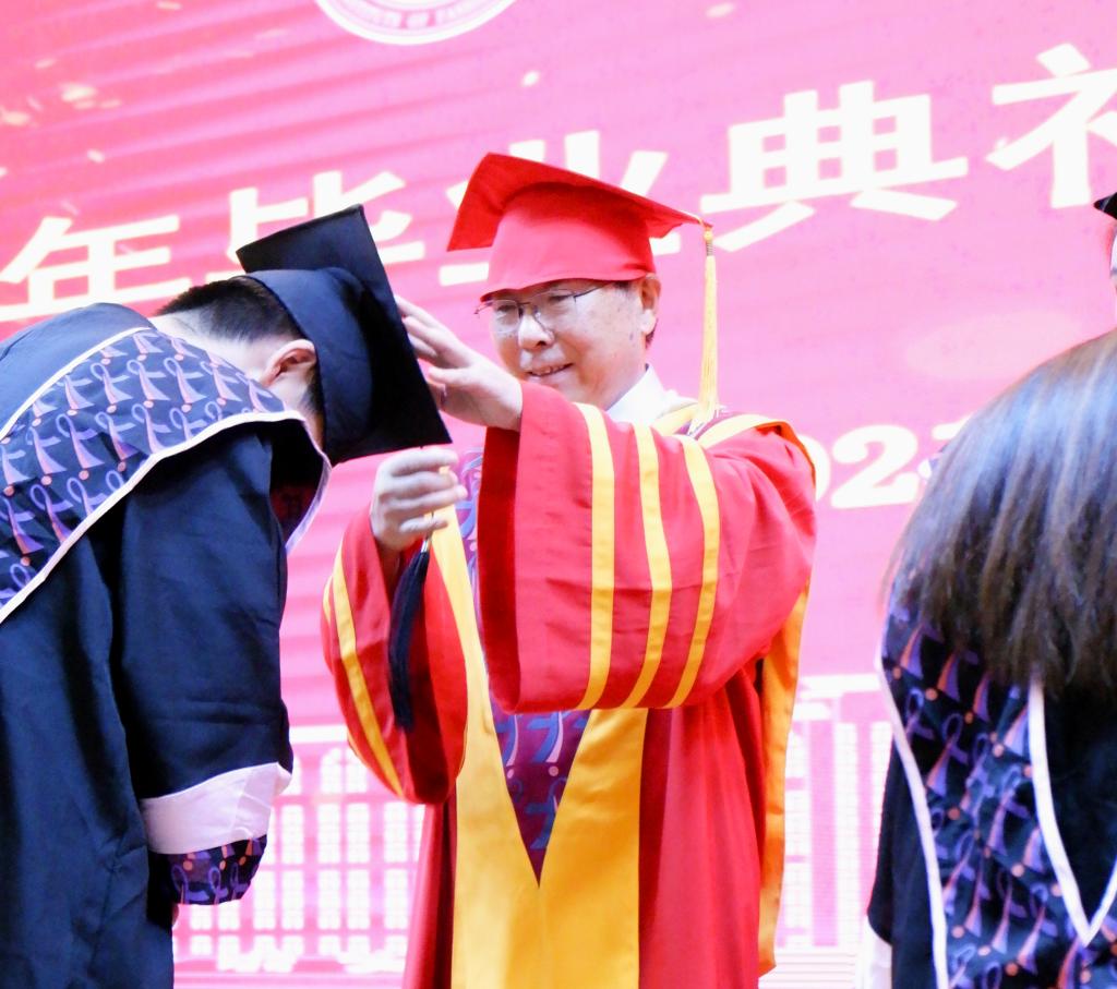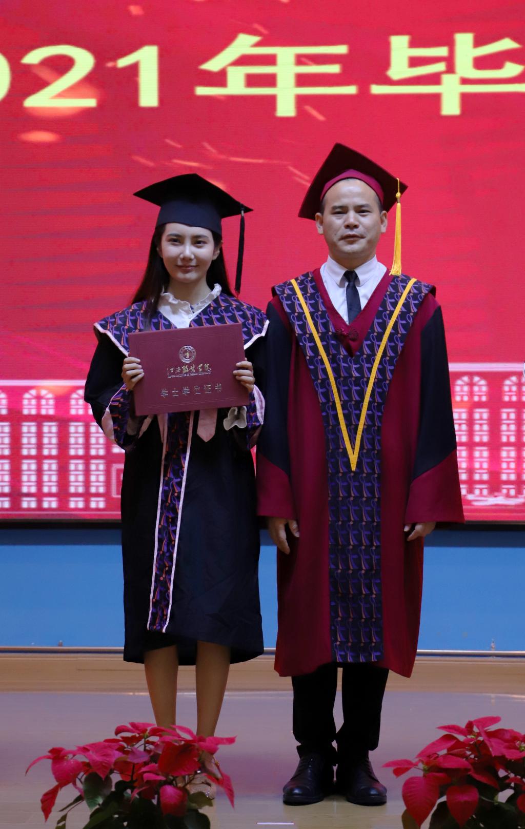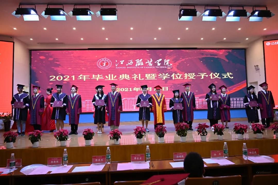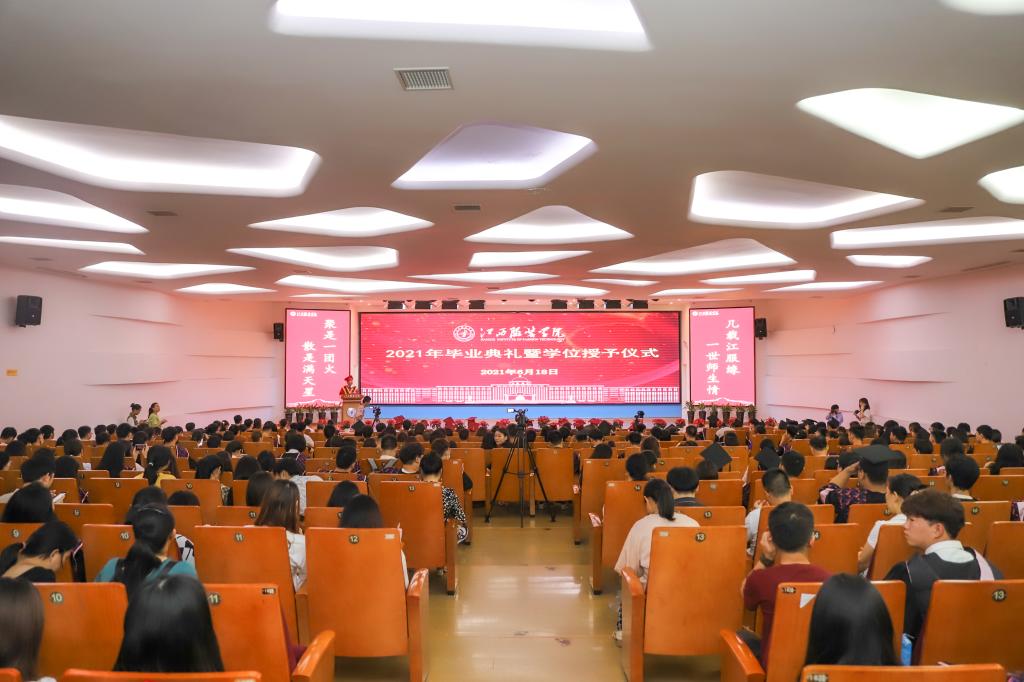 在教师、家长、校友的祝福语中,校长薛家宝,副校长徐炜、陈东生、甘应进,党委副书记唐新强、副校长李宝君、校长助理马国照等校领导为2021届毕业生颁发毕业证书,为获得学士学位的学生正冠拨苏、颁发学位证书并合影留念。