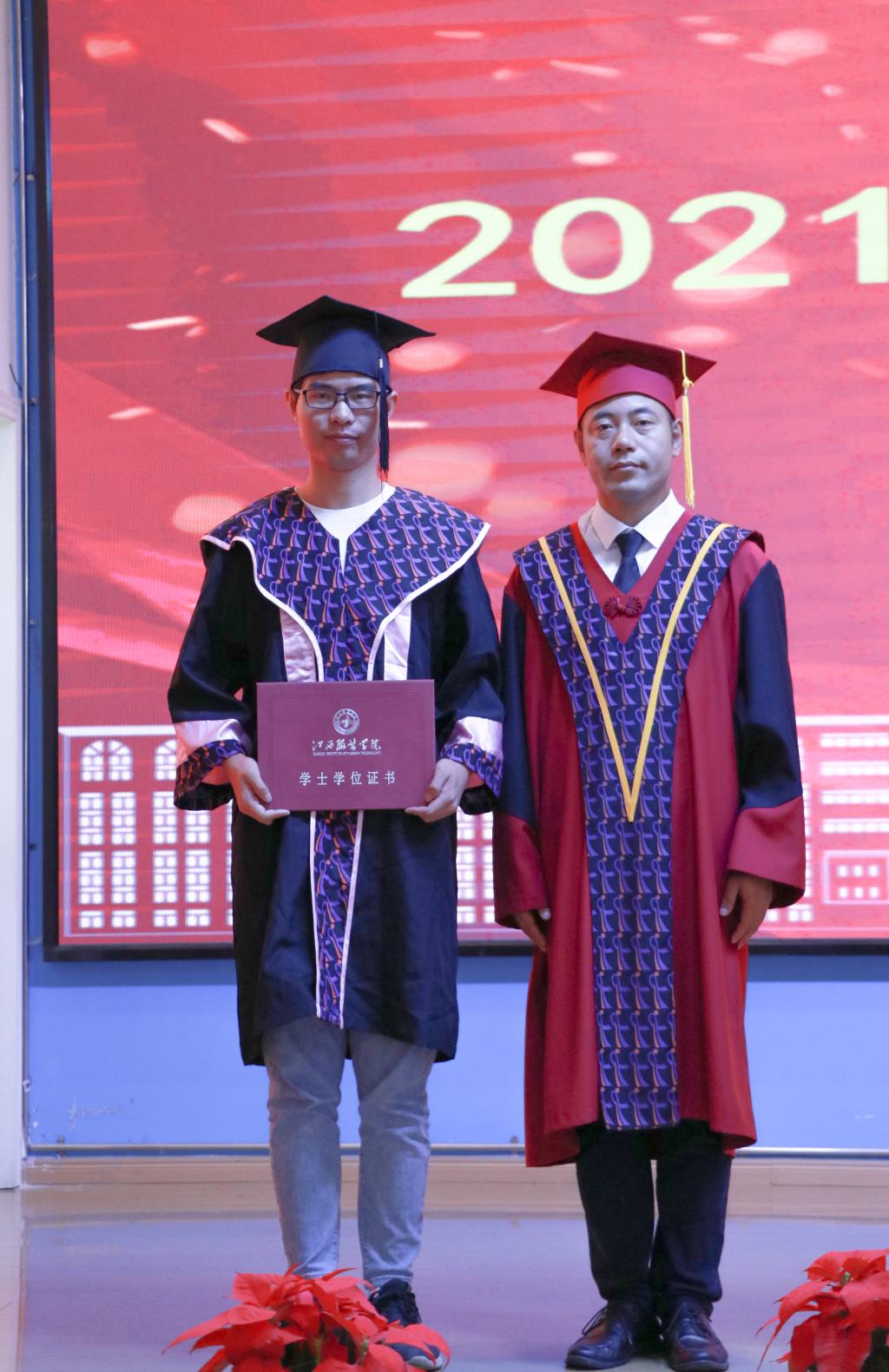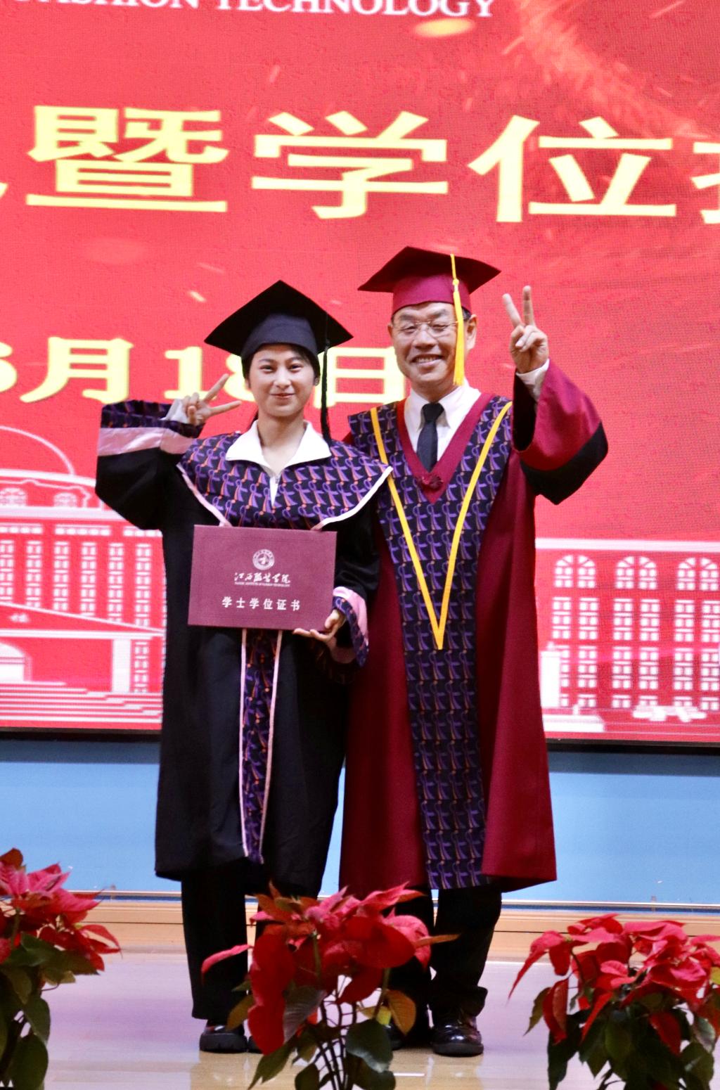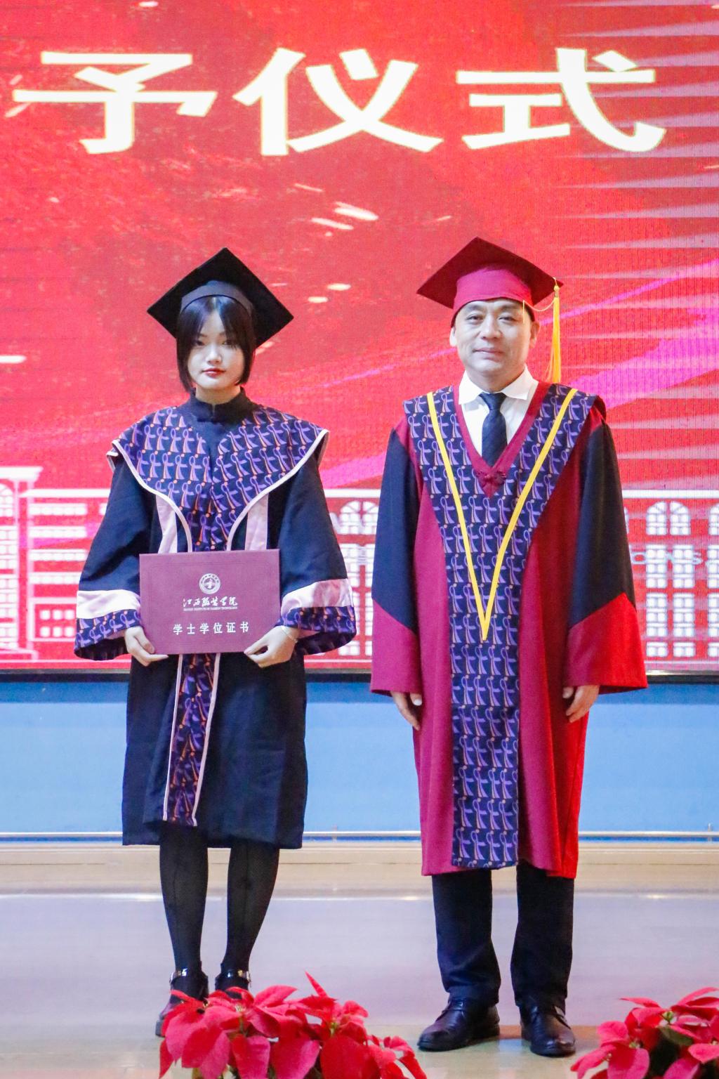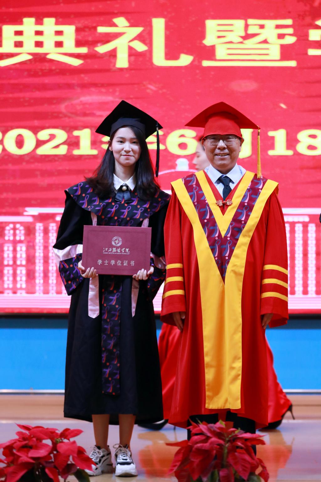 在教师、家长、校友的祝福语中,校长薛家宝,副校长徐炜、陈东生、甘应进,党委副书记唐新强、副校长李宝君、校长助理马国照等校领导为2021届毕业生颁发毕业证书,为获得学士学位的学生正冠拨苏、颁发学位证书并合影留念。