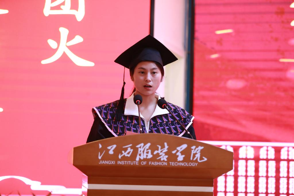 服装设计学院19时装专升本1班杨新月同学、艺术设计学院18环艺专科4班王金凯同学代表毕业生发言,他们回顾了在校期间难忘的求学经历,表达了对母校培养的深厚感激之情。他们表示,将谨记“勤信博雅”的校训,继续恪守“德能兼修、知行合一、尚艺尚技、唯精唯勤”的学风,在新的工作岗位上为母校争光添彩,以优异的成绩向建校30周年,建党100周年献礼。