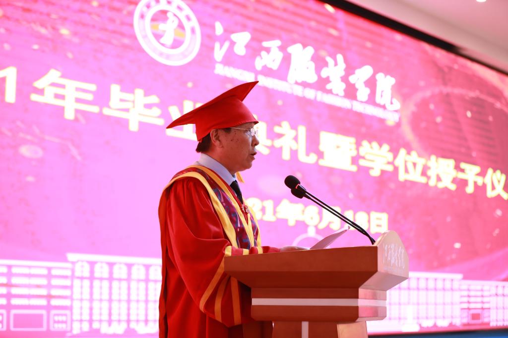 校学位评定委员会副主任、副校长甘应进宣读了学校《关于颁发2021届毕业生毕业证的决定》和《关于授予2021届本科毕业生学士学位的决定》;校党委副书记唐新强宣读了《关于表彰2021届优秀毕业生的决定》。