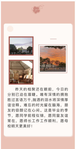 毕业在即,同学情深,师恩难忘;展望未来,激情满怀!母校,是一生的情节,是永久的牵挂,是记忆深处的情感寄托。在一个离别的季节、一个怀念的季节,为母校唱响爱的赞歌。眨眼、转身、翘首又是下一个驿站,道声再见、表达爱与难忘的师生情,美丽的校园留下了你们的青春与足迹。