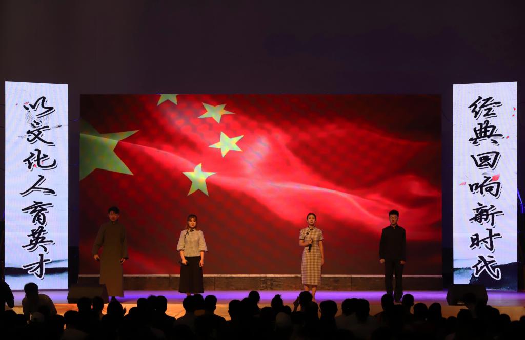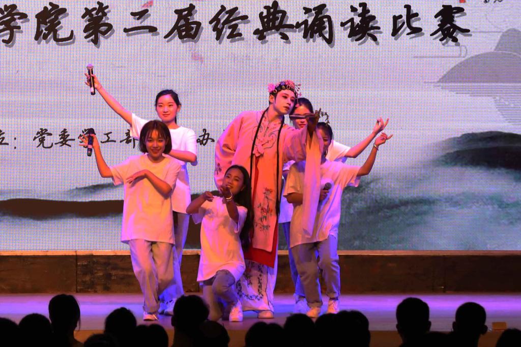 各学院带来的朗诵节目,既有充满学习氛围的《劝学》,又有抒豪情离恨的《龟虽寿》,豪情满怀的《经典咏流传》《品经典文学,展未来》,在或披肝沥胆,或激昂壮烈的配乐中,吟诵经典,抒发情感,师生们深情地演绎每一首诗词,都深深的感染了在座的每一位观众。服装设计学院带来的朗诵《屈原》,凛然悲壮、亢真刚烈,抒发了屈原热爱祖国的高尚感情;艺术设计学院带来的朗诵《少年中国说》,伴着激越的鼓声,字字铿锵有力,慷慨激昂,赢得了阵阵喝彩;时尚传媒学院带来的朗诵《经典咏流传》把师生带入一首首诗词的优美意境里,聆听优秀传统文化的“中国声音”;艺术设计学院带来的朗诵《我爱这土地》用朴实浑厚的嗓音饱含深情地表达出自己与土地生死相依的决心;商学院的朗诵《我的南方和北方》则带领大家一览祖国跨越南北的美景,展现了对大好河山的热爱和对民族复兴的充沛信心。最后,经典诵读大赛在艺术团带来的《经典回响新时代》中落下帷幕。