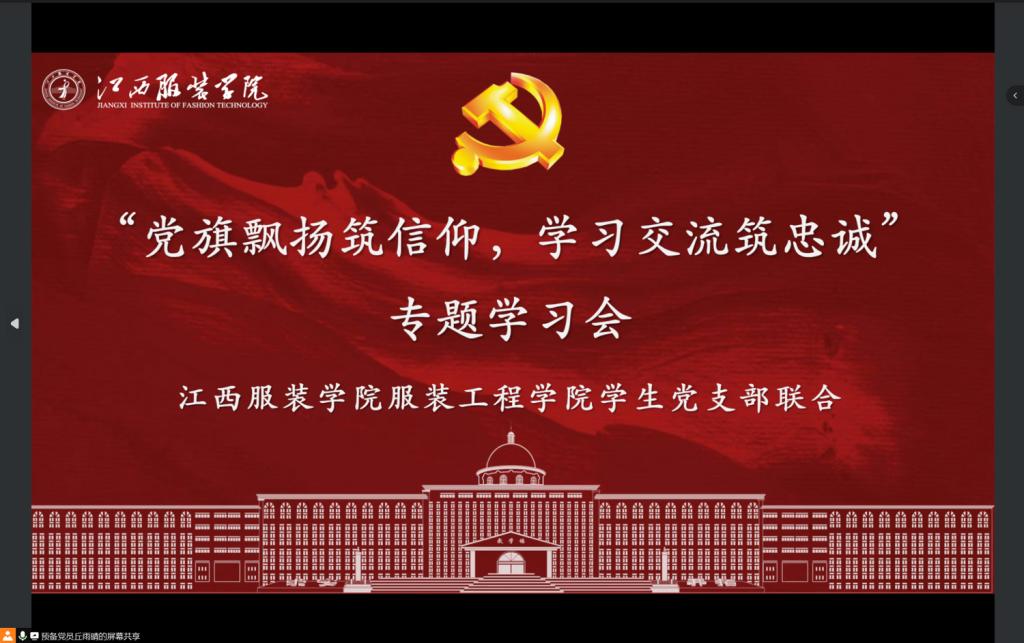 服装工程学院学生第一党支部和第二党支部7月1日线上联合开展“党旗飘扬筑信仰,学习交流筑忠诚”专题学习会,通过集中学习研讨、观看视频、交流学习心得、重温入党誓词等形式,深化学习效果。