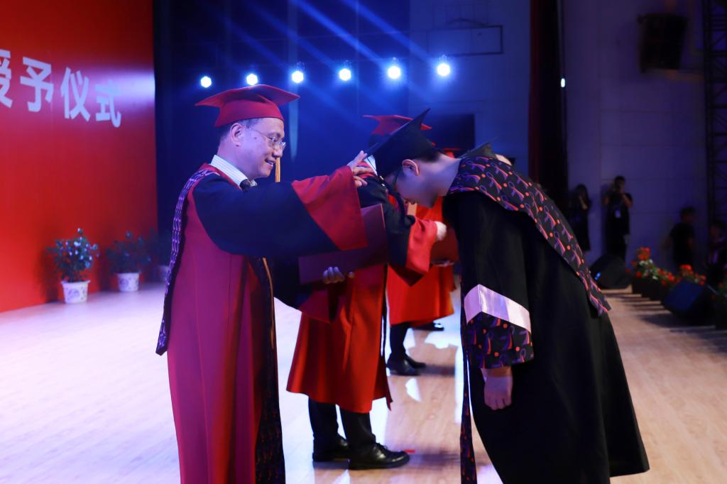 毕业典礼上,与会校领导为毕业生代表颁发了毕业证书。在学校学位评定委员会副主席、副校长陈东生博士宣读《关于授予2019届本科毕业生学士学位的决定》后,学位授予仪式正式开始,校学位评定委员会主席和副主席一一为学士学位获得者颁发学位证书、拨流苏,并送上美好祝福。