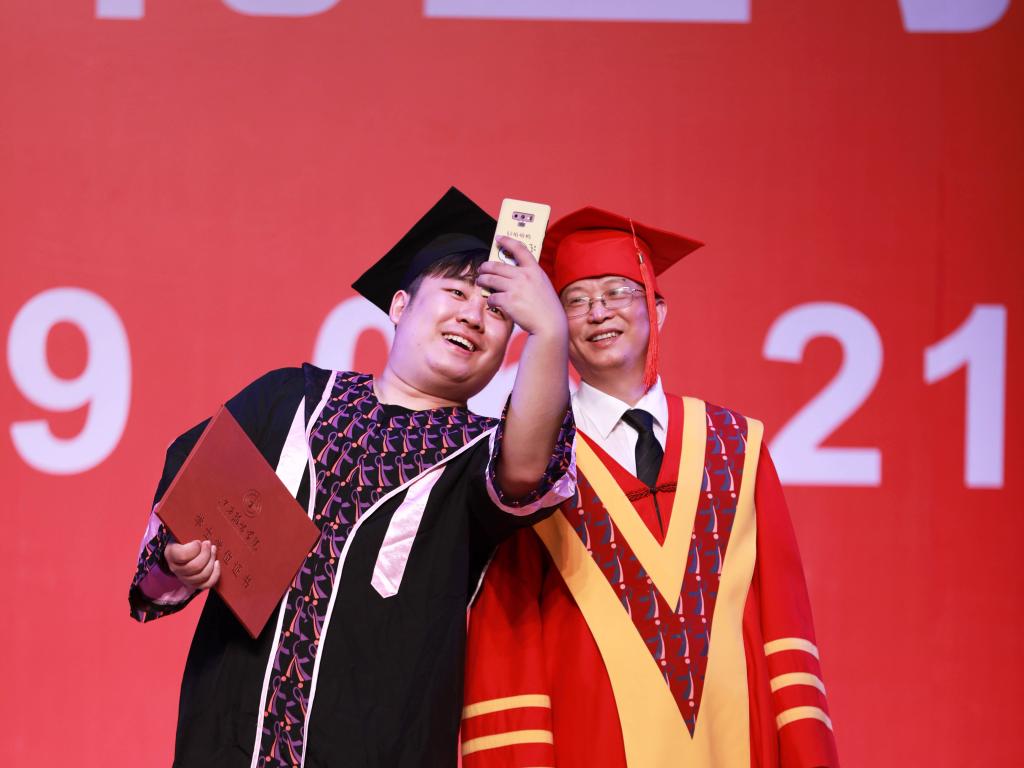 2019届毕业典礼暨学位授予仪式结束后,毕业生们和家长久久不愿离开,或是和校长、老师们合影留念,或是和同学们拥抱告别。