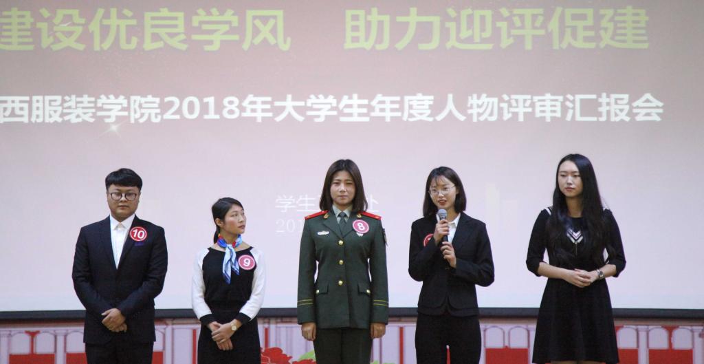 服装报讯(记者/李瑞思刘雪晶)为进一步贯彻落实全国教育大会精神,落实立德树人根本任务,弘扬奋斗进取精神,深入挖掘、培树大学生身边的先进典型,充分发挥先进典型的示范引领作用,促进大学生德智体美劳全面发展和健康成长。12月18日下午,我校在思贤楼三楼报告厅举行了以“讲好成长故事,培养奋斗精神;建设优良学风,助力迎评促建”为主题的2018年大学生年度人物评审汇报会。校党委副书记高建国出席了汇报会,党委学工部(处)部(处)长张建荣、校评建办副主任周文辉和各学院党总支副书记担任评委。各学院学生代表400余人到场观摩。
