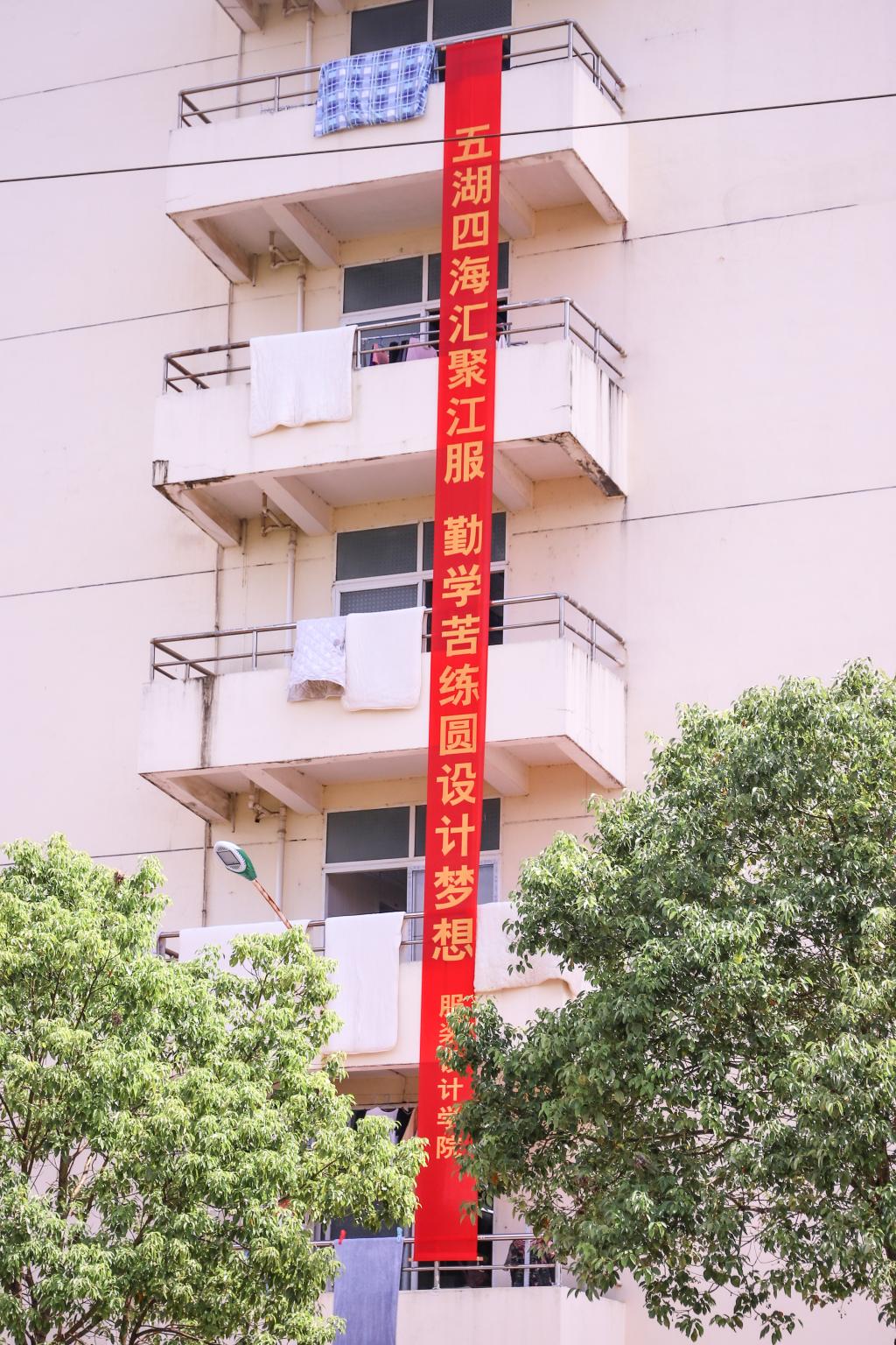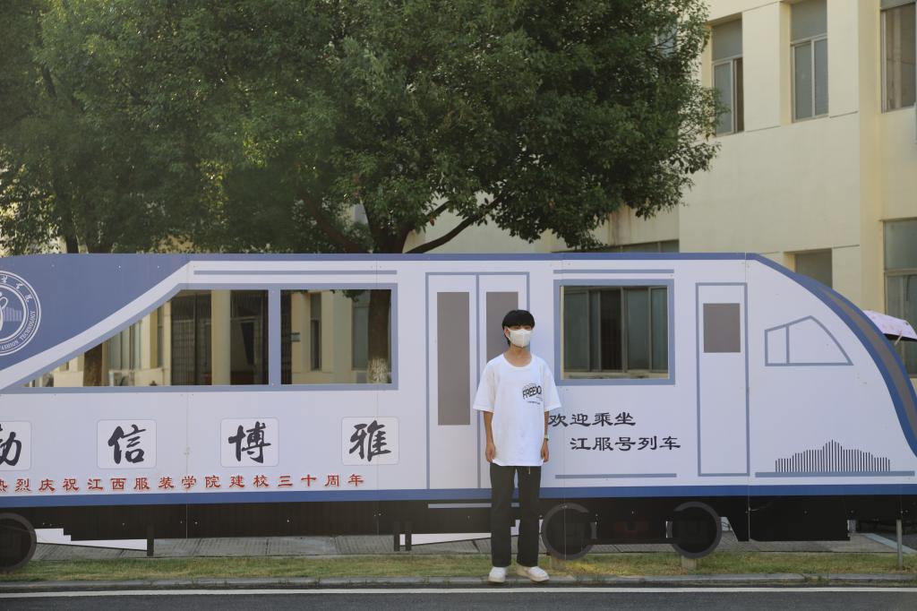 除了创意十足的横幅,校园中随风飘舞的彩旗,伫立在校园里的“我爱江服”“江服号列车”等随处可见的拍照展板,也深藏着江服师生对萌新们的浓浓爱意。