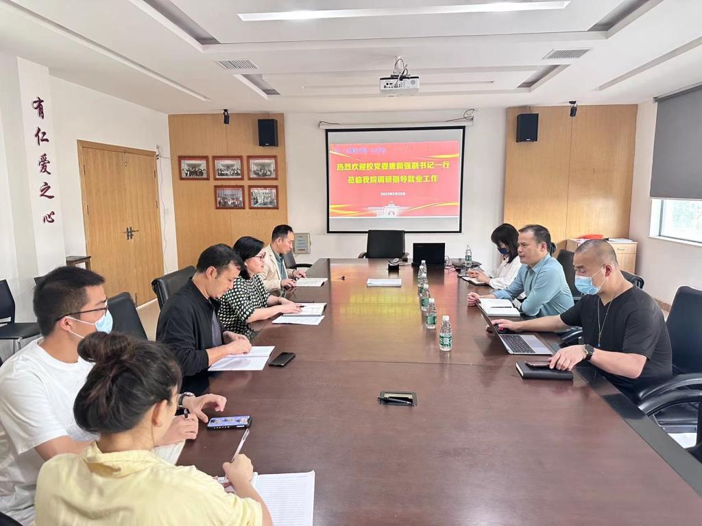 新闻中心讯(就业处供稿)为深入开展学习贯彻习近平新时代中国特色社会主义思想主题教育,将学习成效转变成工作实效。5月25日,校党委副书记唐新强、就业处副处长鲍仁成一行深入各二级学院进行现场调研、推进就业工作,促进各二级学院提升作风要求、质量要求、目标要求,确保2023届毕业生更加充分、更高质量就业,推动在毕业生就业工作“建新功”上取得实实在在的成效。