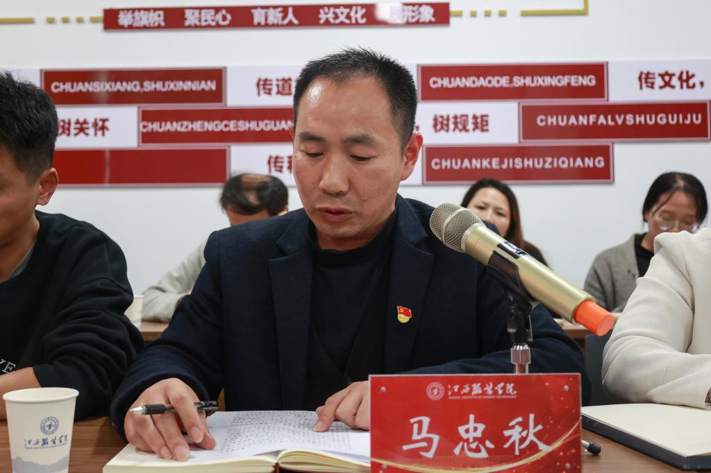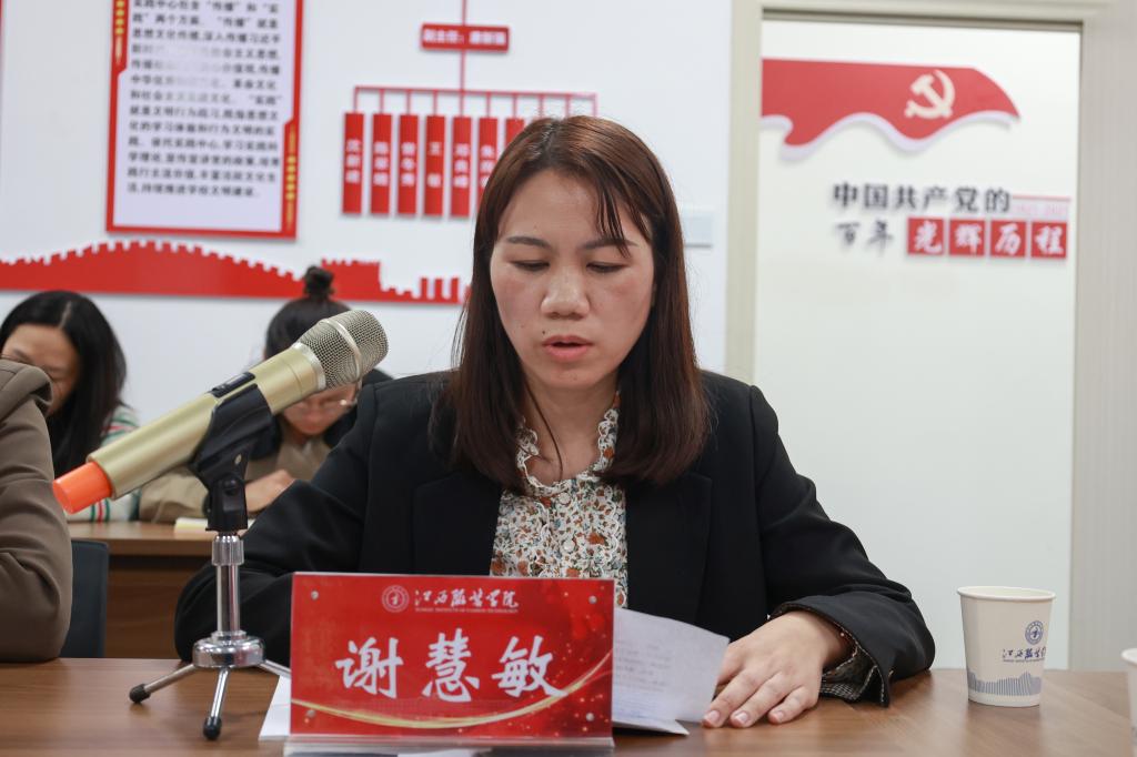 会上,马克思主义学院院长肖杰、校团委书记孟安然、人文学院党总支副书记马忠秋、全国民办高校优秀辅导员、学工处思政科副科长刘检莲、民盟江西服装学院支部主任委员虞谦、党外知识分子代表、江西省“三八红旗手”“十佳军嫂”谢慧敏、2022年度学校服务标兵、组织部干事毛益剑、江服大学生宣讲团成员都雨涵围绕学习宣传贯彻党的二十大精神,结合工作实际,作了交流发言。