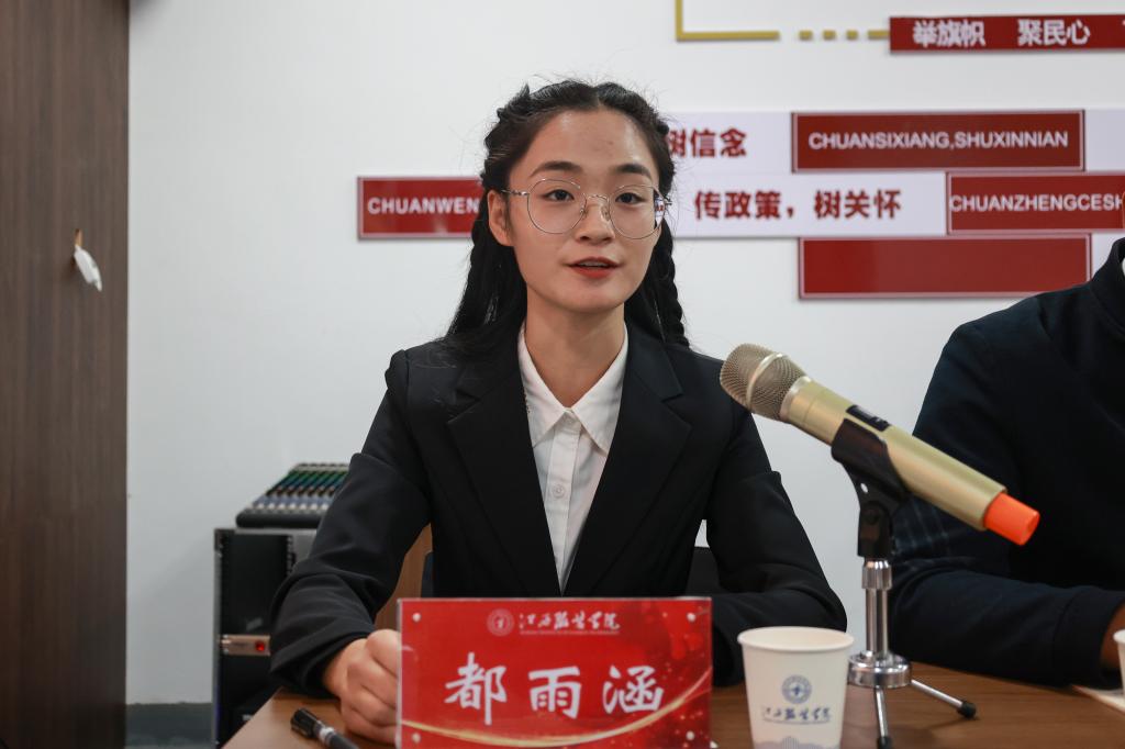 江服大学生宣讲团成员都雨涵表示,学习党的二十大精神,要内化于心,外化于行,落实到自身。作为江服大学生宣讲团的成员,在学习了党的二十大精神后,我愿意以行动证明自己的决心,紧跟党的步伐,怀揣赤子之心,不断学习理论知识,不断深厚历史文化素养,不断加强社会实践,不断打磨演讲技巧,把党在二十大报告中的新观点、新论断、新思想讲出来,把党的千秋伟业、祖国的万里河山讲出来,让党的二十大精神第一时间走近师生,把大家的思想和行动统一到党的二十大精神和习近平新时代中国特色社会主义思想上来。切实体会党的二十大报告的独特思想魅力,真正做到学深悟透、融会贯通、真信笃行,共同努力谱写新时代中国特色社会主义更加绚丽的华章。