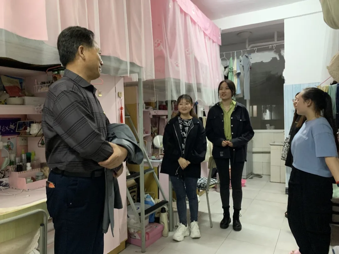 陈东生来到清河6栋学生宿舍,18服工本科2班王欣敏同学正在宿舍做作业,看到领导的到来非常激动,连忙招呼领导坐下。陈东生了解到同学有考研和创业的想法,鼓励同学们勇于追梦,勤于圆梦,期待听到你们考研成功的好消息。