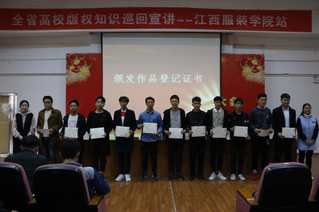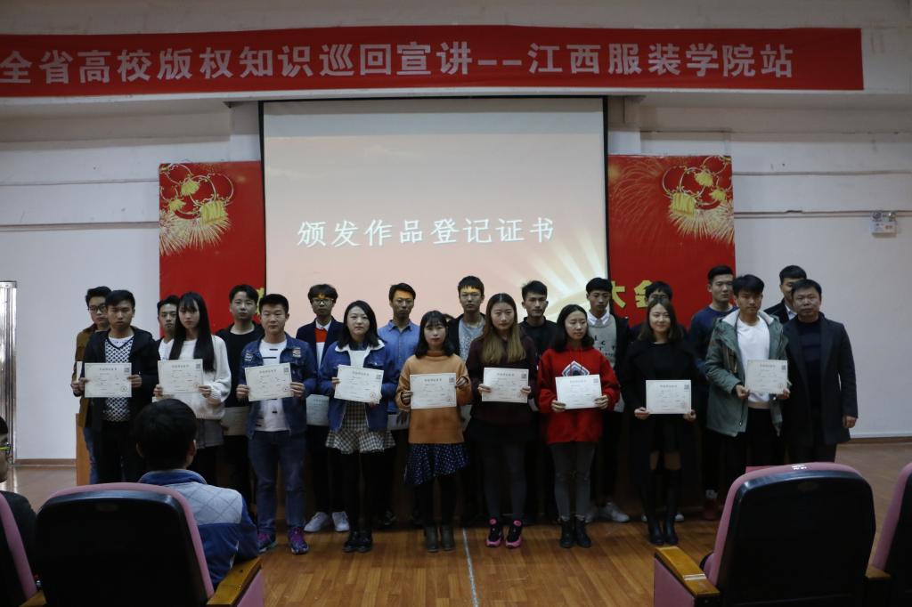 在宣讲活动现场,还举行了 “版权服务工作站”授牌仪式及为“版权服务志愿者”、学生权利人代表颁发证书仪式。江西服装学院“版权服务工作站”成立的目的,旨在为全校师生提供版权登记、业务培训、纠纷调解、维权服务等专业化版权服务。