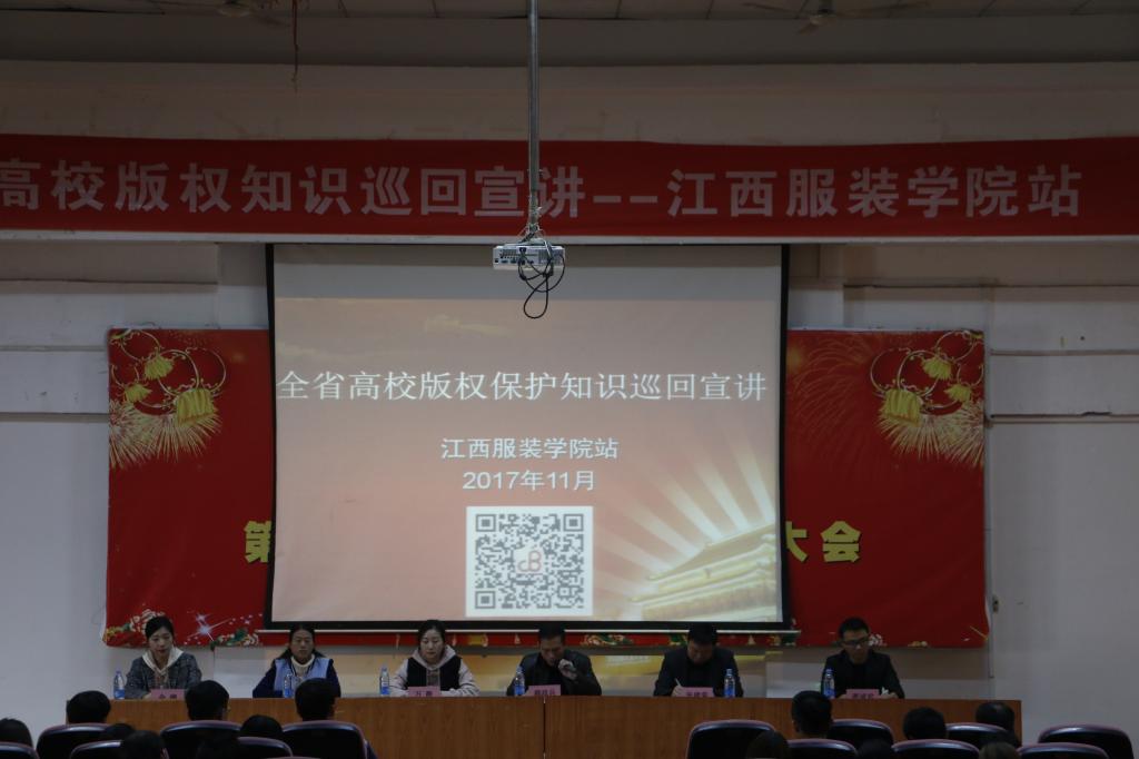 服装报讯(记者:刘锭安 实习记者:金薇薇)11月28日下午,由省新闻出版广电局(版权局)、团省委联合举办的“全省高校版权知识巡回宣讲”第六场活动在我校艺术楼南六报告厅举行。宣讲会由江西省版权保护中心干部万静主讲,江西省版权局主任赖政兵,校党委委员、学工部(处)部(处)长张建荣出席宣讲会,来自服装设计学院、服装工程学院、艺术设计学院、时尚传媒学院等500余名老师、学生参加宣讲活动。
