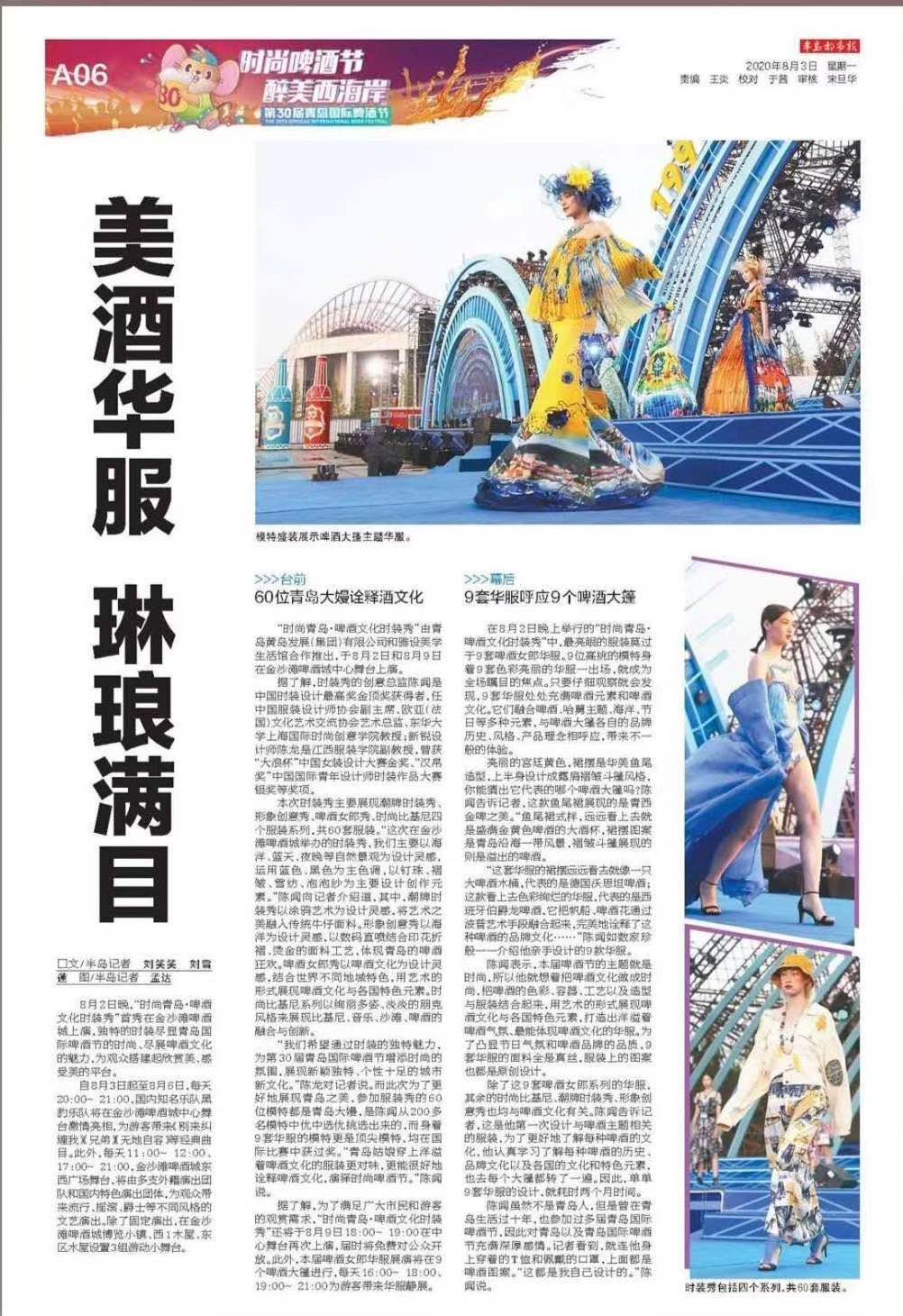 新闻中心讯:8月2日——8月9日,第30届青岛国际啤酒节“啤酒文化时装秀”在青岛金沙滩啤酒城绝美上演。本次时装秀从啤酒中吸取灵感,以“醉魅”为主题,以啤酒之醉,城市之魅,让啤酒艺术之美融入现代时尚,激情的笔触给予新的时尚活力,赋予时装秀多种可能性。时装秀创意总监陈闻携手我校教师、新锐设计师陈龙运用独特的时装展现出啤酒的时尚元素,升华着啤酒文化的魅力和内涵,给观众带来一场与众不同的的视觉盛宴。