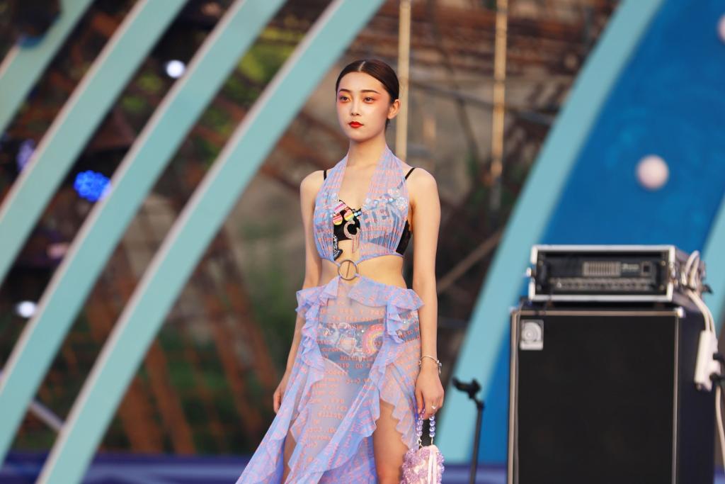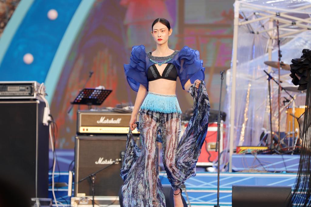 本次大秀共呈现了四个服装系列:时尚比基尼,潮牌时装秀,形象创意秀,啤酒女郎秀。“这次在金沙滩啤酒城举办的时装秀,我们主要以海洋、蓝天、夜晚等自然景观为设计灵感,运用蓝色、黑色为主色调,以钉珠、褶皱、雪纺、泡泡纱为主要设计创作元素。”陈闻向记者介绍道,其中潮牌时装秀以涂鸦艺术为设计灵感,将艺术之美融入传统牛仔面料。形象创意秀以海洋为设计灵感,以数码直喷结合印花折褶、烫金的面料工艺,体现青岛的啤酒狂欢。啤酒女郎秀以啤酒文化为设计灵感,结合世界不同地域特色,用艺术的形式展现啤酒文化与各国特色元素。时尚比基尼系列以绚丽多姿、淡淡的朋克风格来展现比基尼、音乐、沙滩、啤酒的融合与创新。