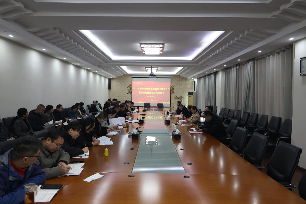新闻中心讯(文/龙瑞行 图/万强)2月28日上午,我校召开2023年春季学期师生思想安全稳定工作暨平安校园建设工作研判会,传达学习上级相关文件和会议精神,研究部署当前和下一阶段学校安全稳定和意识形态工作的具体举措,签订2023年平安建设(综治工作)和意识形态工作责任书。校党委书记陈付龙、副理事长涂燕萍等在家校领导出席会议,各学院党政负责人、各部门主要负责人参加会议。党委副书记唐新强主持会议。