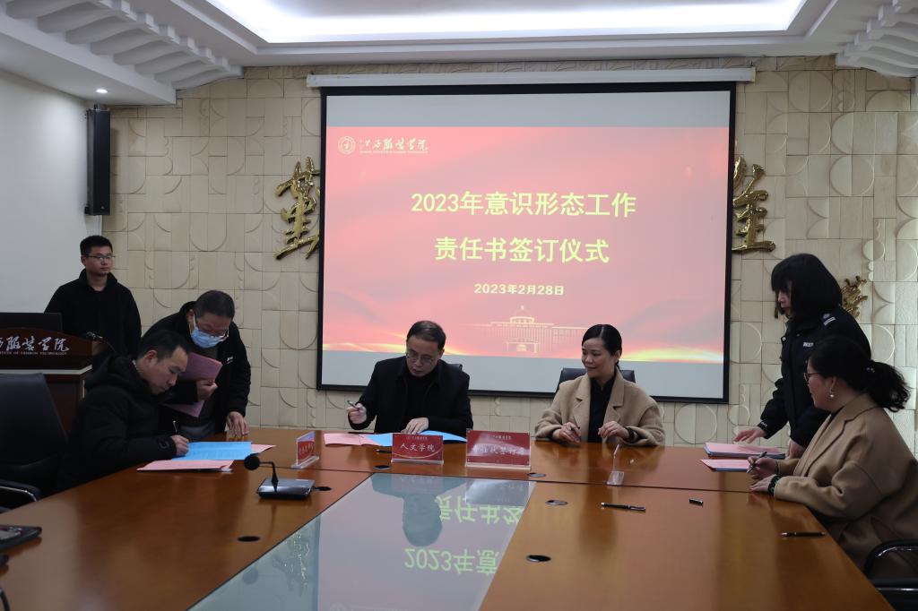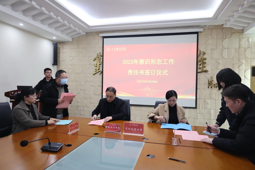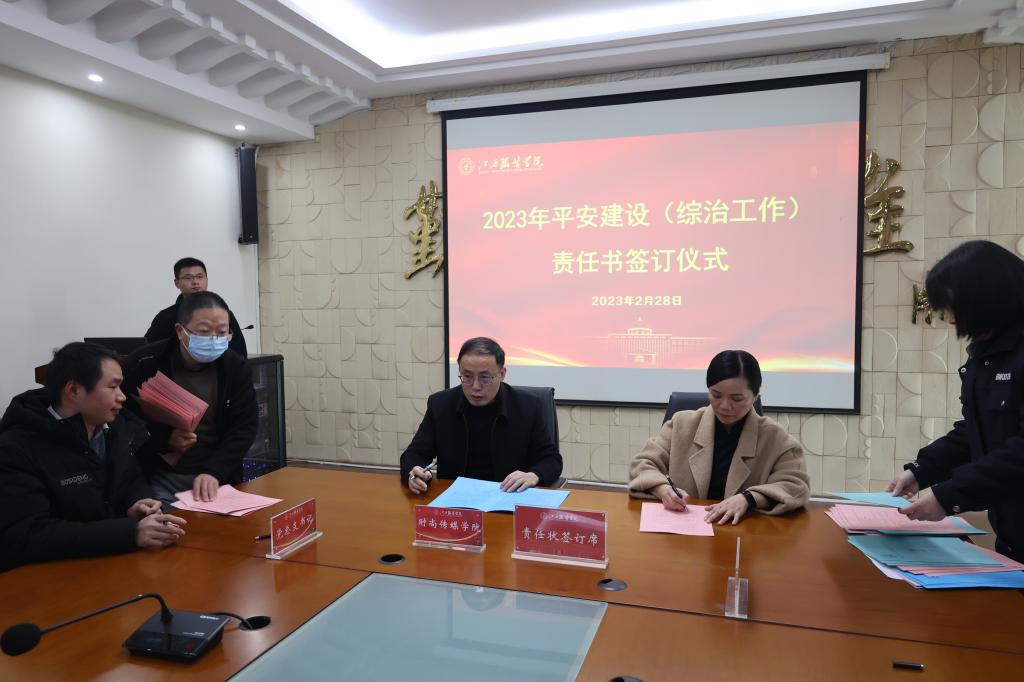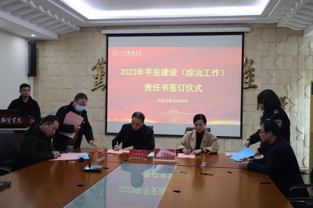 随后,举行了江西服装学院2023年平安建设(综治工作)和意识形态工作责任书签订仪式。党委书记陈付龙、副理事长涂燕萍共同与各二级学院党政负责人签订了责任书。