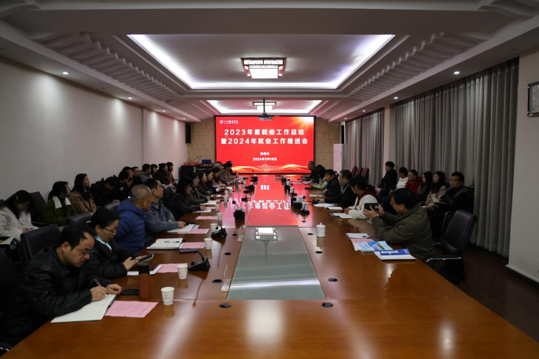 新闻中心讯(就业处供稿)岁序更替,华章新启。为深入贯彻习近平总书记重要指示批示精神,全面落实两会关于就业工作的指示精神,落实教育部、省教育厅会议精神,同时全面总结我校2023年毕业生就业工作,表彰先进集体,推进2024届毕业生就业工作,3月18日下午,江西服装学院2023年度就业工作总结暨2024年就业工作推进会在行政楼二楼会议室隆重举行。校长薛家宝、校党委副书记唐新强,校长助理闵悦出席会议。就业处、教务处、学工处、各二级学院党政负责人、就业联络员、各毕业班班主任参会。会议由校党委副书记唐新强主持。